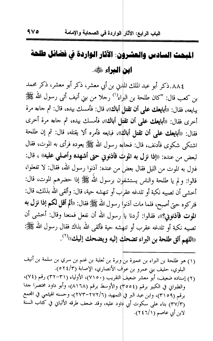 المبحث السادس والعشرون: الآثار الواردة في فضائل طلحة ابن البراء -رضي اللَّه عنه-.