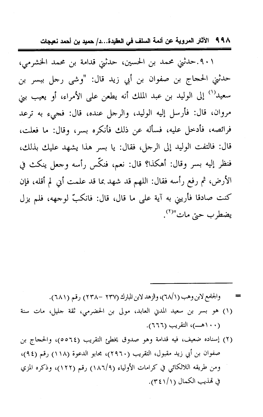 ٩٠١ - حدثني محمد بن الحسين، حدثني قدامة بن محمد الخشرمي، حدثني الحجاج بن صفوان بن أبي زيد قال: "وشى رجل ببسر بن سعيد (¬١) إلى الوليد بن عبد الملك أنه يطعن على الأمراء، أو يعيب بي مروان، قال: فأرسل إليه الوليد، والرجل عنده، قال: فجيء به ترعد فرائصه، فأدخل عليه، فسأله عن ذلك فأنكره بسر، وقال: ما فعلت، قال: فالتفت الوليد إلى الرجل، فقال: يا بسر هذا يشهد عليك بذلك، فنظر إليه بسر وقال: أهكذا؟ قال: نعم، فنكّس رأسه وجعل ينكث في الأرض، ثم رفع رأسه فقال: اللهم قد شهد بما قد علمت أني لم أقله، فإن كنت صادقا فأريني به آية على ما قال، قال: فانكبّ لوجهه، فلم يزل يضطرب حتى مات" (¬٢).