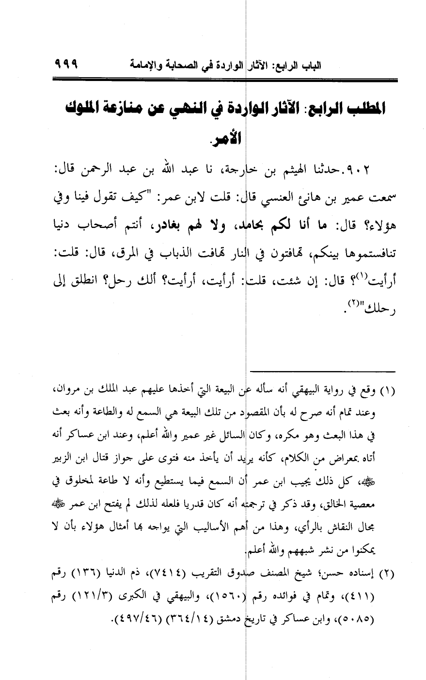 ٩٠٢ - حدثنا الهيثم بن خارجة، نا عبد اللَّه بن عبد الرحمن قال: سمعت عمير بن هانئ العنسي قال: قلت لابن عمر: "كيف تقول فينا وفي هؤلاء؟ قال: ما أنا لكم بحامد، ولا لهم بغادر، أنتم أصحاب دنيا تنافستموها بينكم، تهافتون في النار تهافت الذباب في المرق، قال: قلت: أرأيت (¬١)؟ قال: إن شئت، قلت: أرأيت، أرأيت؟ ألك رحل؟ انطلق إلى رحلك" (¬٢).