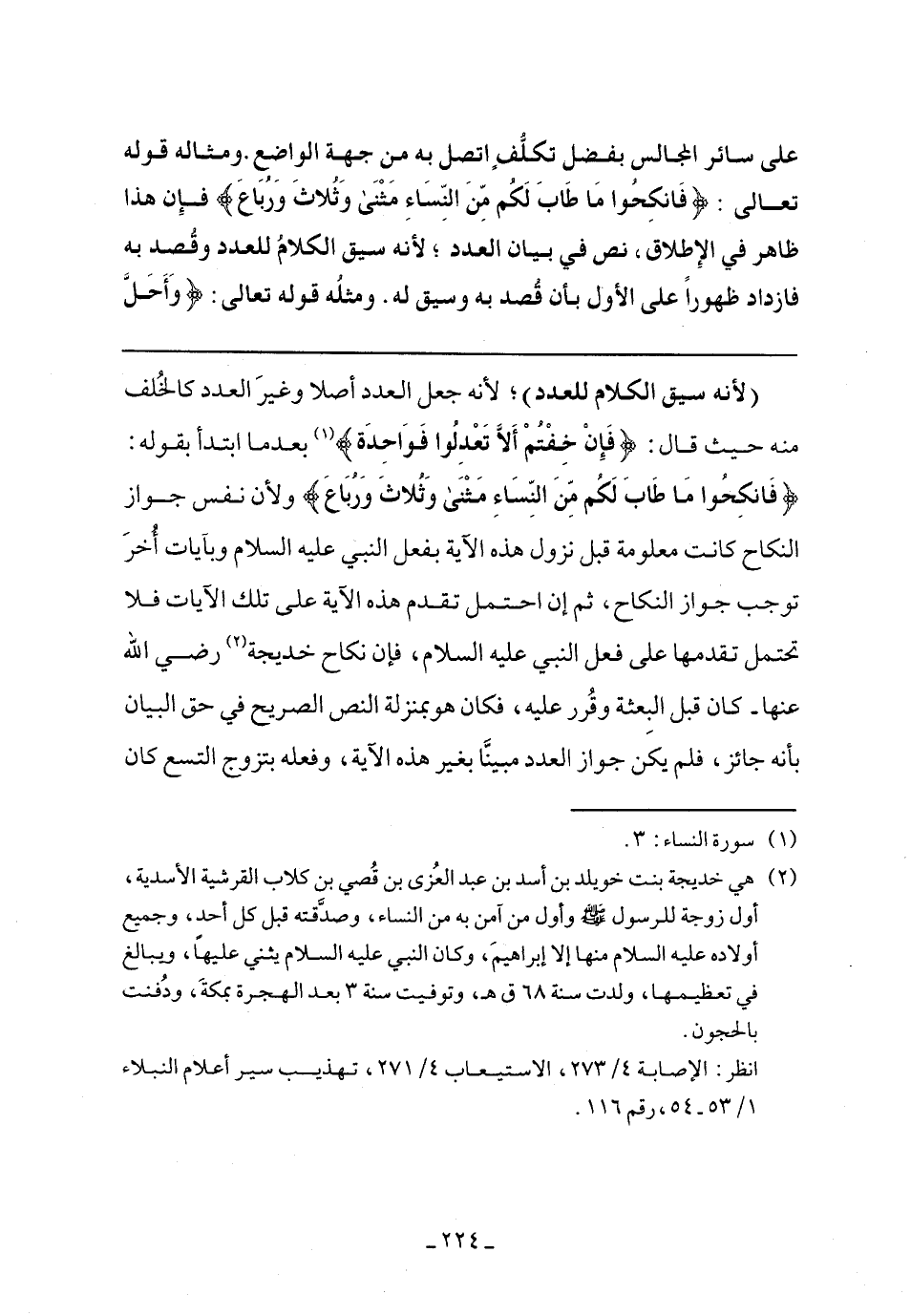 (لأنه سيق الكلام للعدد)؛ لأنه جعل العدد أصلًا وغير العدد كالخلف منه حيث قال: {فَإِنْ خِفْتُمْ أَلاَّ تَعْدِلُوا فَوَاحِدَةً} بعد ما ابتدأ بقوله: {فَانكِحُوا مَا طَابَ لَكُمْ مِنَ النِّسَاءِ مَثْنَى وَثُلاثَ وَرُبَاعَ} ولأن نفس جواز النكاح كانت معلومة قبل نزول هذه الآية بفعل النبي عليه السلام وبآيات أخر توجب جواز النكاح، ثم إن أحتمل تقدم هذه الآية على تلك الآيات فلا تحتمل تقدمها على فعل النبي عليه السلام، فإن نكاح خديجة رضي الله عنها- كان قبل البعثة وقرر عليه، فكان هو بمنزلة النص الصريح في حق البيان بأنه جائز، فلم يكن جواز العدد مبينًا بغير هذه الآية، وفعله بتزوج التسع كان