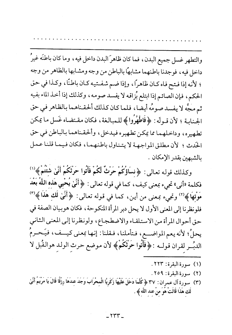 {أَنَّى لَكِ هَذَا} فلو نظرنا إلى المعنى الأول لا يحل دبر المرأة المنكوحة، فكان هو بيان الصفة في حق أحوال المرأة من الاستلقاء والاضطجاع، ولو نظرنا إلى المعنى الثاني يحل؛ لأنه يعم المواضع، فتأملنا، وقلنا: إنها بمعنى كيف، فيحرم الدبر لقرآن قوله: {فَاتُوا حَرْثَكُمْ} لأن موضع حرث الولد هو القبل لا