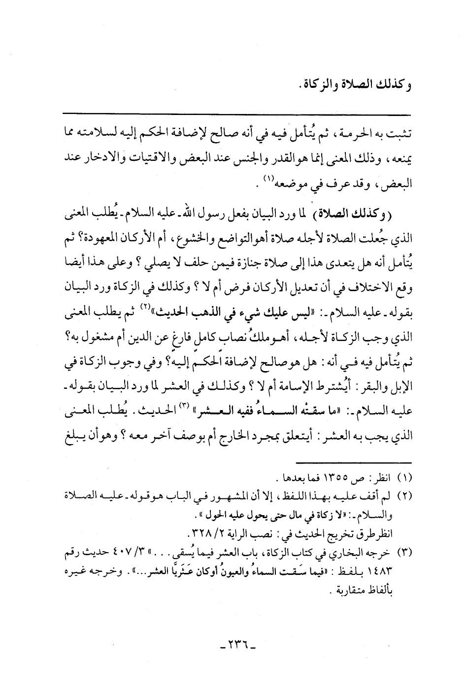 (وكذلك الصلاة) لما ورد البيان بفعل رسول الله- عليه السلام- يطلب المعنى الذي جعلت الصلاة لأجله صلاة أهو التواضع والخشوع، أم الأركان المعهودة؟ ثم يتأمل أنه هل يتعدى هذا إلى صلاة جنازة فيمن حلف لا يصلي؟ وعلى هذا أيضًا وقع الاختلاف في أن تعديل الأركان فرض أم لا؟ وكذلك في الزكاة ورد البيان بقوله- عليه السلام- "ليس عليك شيء في الذهب الحديث" ثم يطلب المعنى الذي وجب الزكاة لأجله؛ أهو ملك نصاب كامل فارغ عن الدين أم مشغول به؟