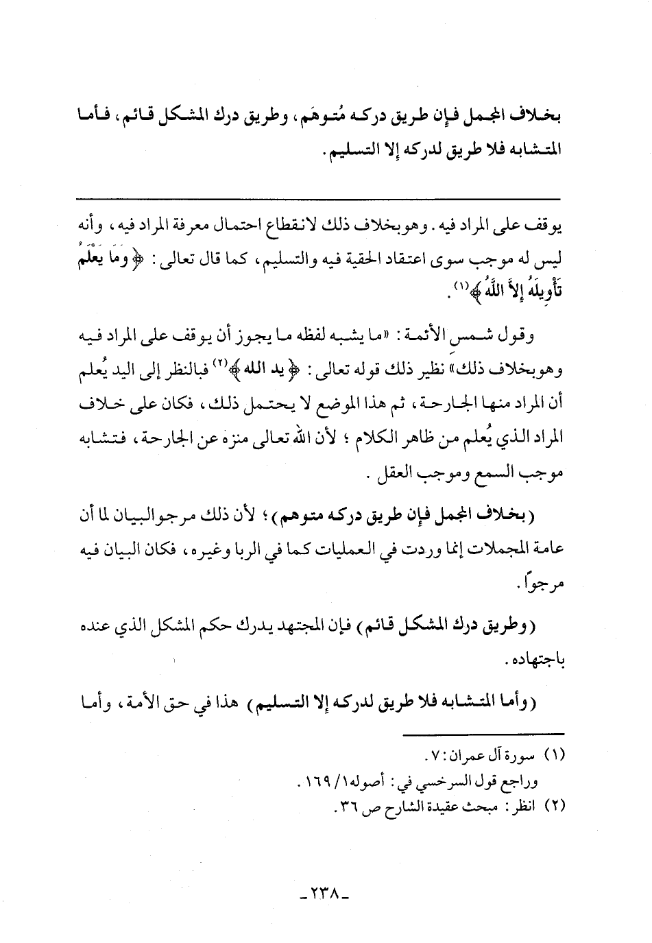 وقول شمس الأئمة: "ما يشبه لفظه ما يجوز أن يوقف على المراد فيه وهو بخلاف ذلك" نظير ذلك قوله تعالى: {يَدِ اللَّهِ} فبالنظر إلى اليد يعلم أن المراد منها الجارحة، ثم هذا الموضع لا يحتمل ذلك، فكان على خلاف المراد الذي يعلم من ظاهر الكلام؛ لأن الله تعالى منزه عن الجارحة، فتشابه موجب السمع وموجب العقل.