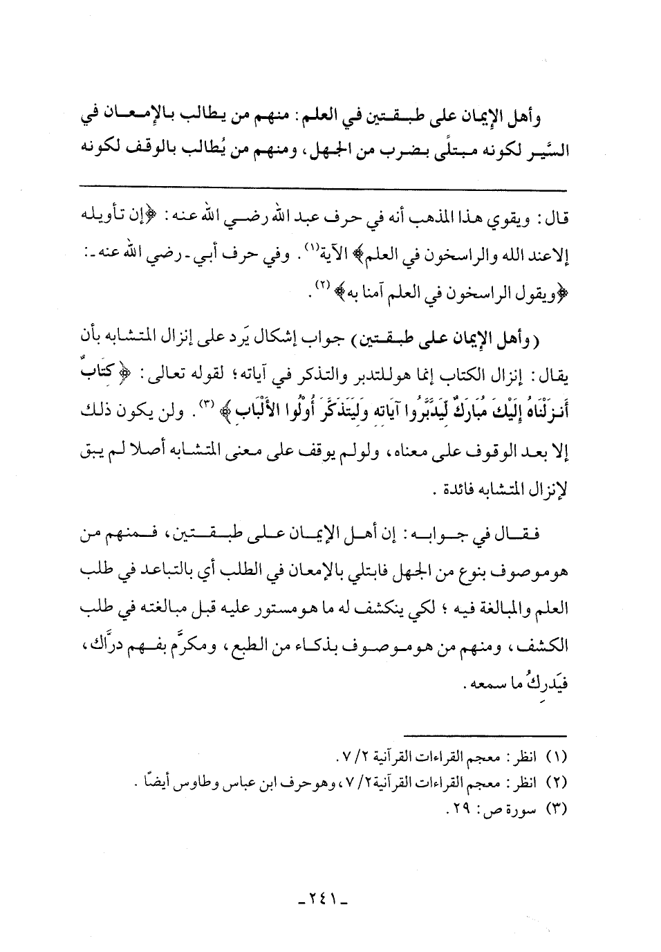 (وأهل الإيمان على طبقتين) جواب إشكال يرد على إنزال المتشابه بأن يقال: إنزال الكتاب إنما هو للتدبير والتذكر في آياته؛ لقواه تعالى: {كِتَابٌ أَنزَلْنَاهُ إِلَيْكَ مُبَارَكٌ لِيَدَّبَّرُوا آيَاتِهِ وَلِيَتَذَكَّرَ أُوْلُوا الأَلْبَابِ}. ولن يكون ذلك إلا بعد الوقوف على معناه، ولو لم يوقف على معنى المتشابه أصلًا لم يبق لإنزال المتشابه فائدة.
