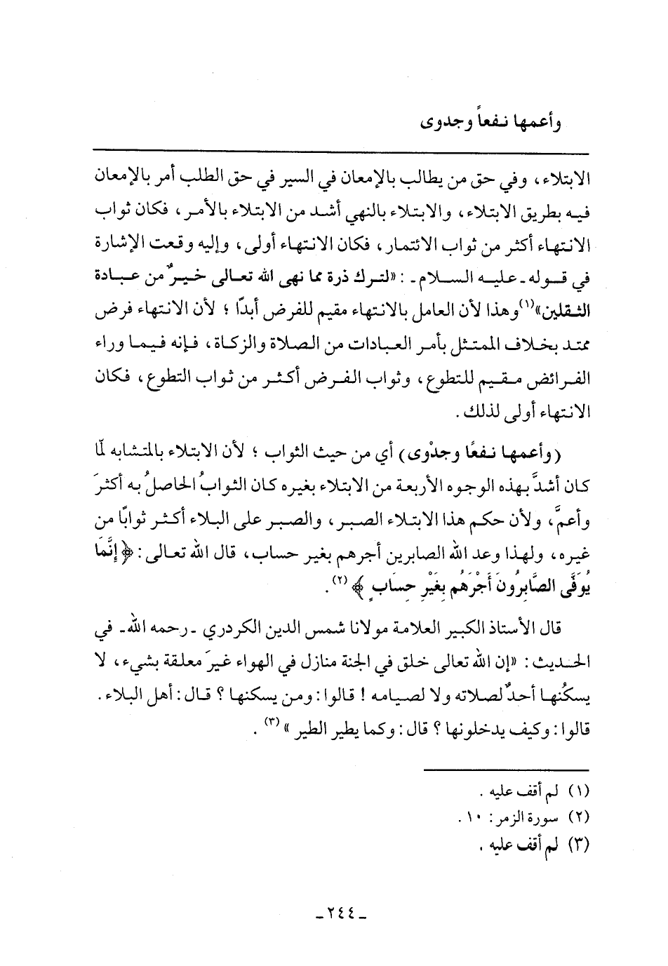 الابتلاء، وفي حق من يطالب بالإمعان في السير في حق الطلب أمر بالإمعان فيه بطريق الابتلاء، والابتلاء بالنهي أشد من الابتلاء بالأمر، فكان ثواب الانتهاء أكثر من ثواب الائتمار، فكان الانتهاء أولى، وإليه وقعت الإشارة في قوله- عليه السلام-: "لترك ذرة مما نهى الله تعالى خير من عبادة الثقلين" وهذا لأن العامل بالانتهاء مقيم للفرض أبدًا؛ لأن الانتهاء فرض ممتد بخلاف المتمثل بأمر العبادات من الصلاة والزكاة، فإنه فيما وراء الفرائض مقيم للتطوع، وثواب الفرض أكثر من ثواب التطوع، فكان الانتهاء أولى لذلك.