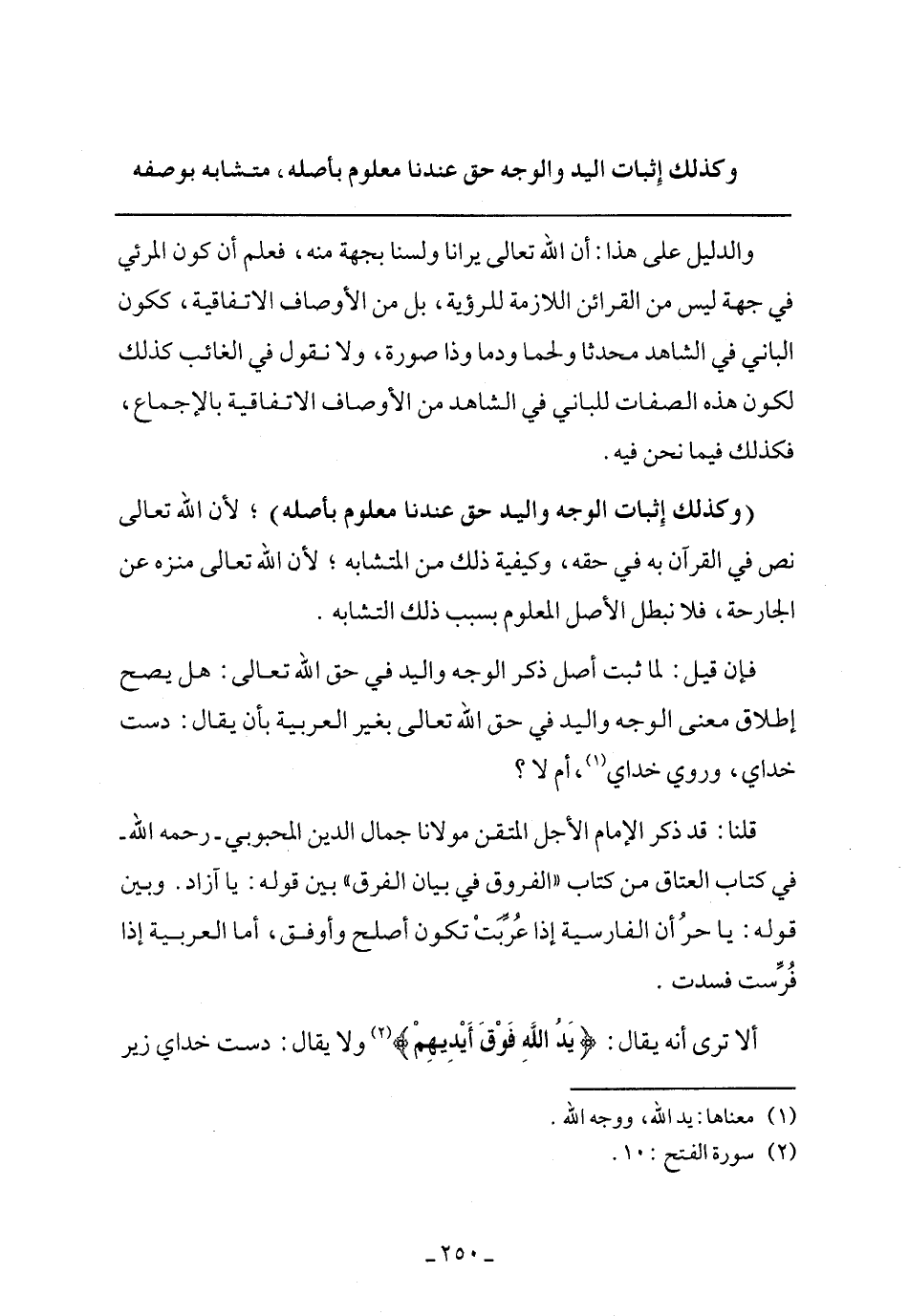 فإن قيل: لما ثبت أصل ذكر الوجه واليد في حق الله تعالى: هل يصح إطلاق معنى الوجه واليد في حق الله تعالى بغير العربية بأن يقال: دست خداي، وروي خداي، أم لا؟
