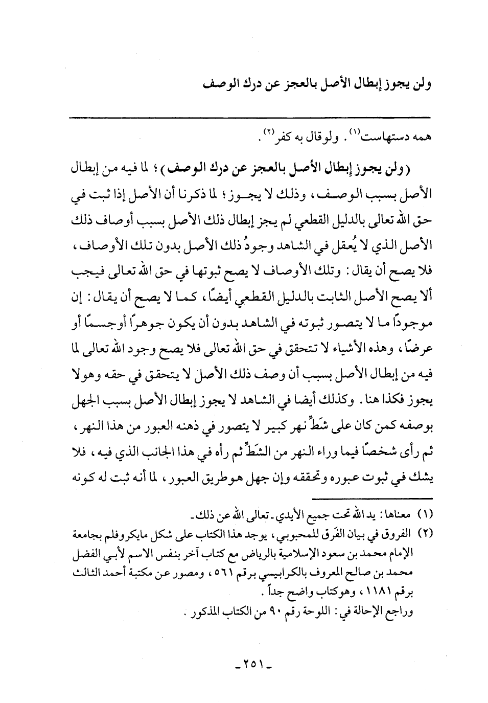 (ولن يجوز إبطال الأصل بالعجز عن درك الوصف)؛ لما فيه من إبطال الأصل بسبب الوصف، وذلك لا يجوز؛ لما ذكرنا أن الأصل إذا ثبت في حق الله تعالى بالدليل القطعي لم يجز إبطال ذلك الأصل بسبب أوصاف ذلك الأصل الذي لا يعقل في الشاهد وجود ذلك الأصل بدون تلك الأوصاف، فلا يصح أن يقال: وتلك الأوصاف لا يصح ثبوتها في حق الله تعالى فيجب ألا يصح الأصل الثابت بالدليل القطعي أيضًا، كما لا يصح أن يقال: إن موجودًا ما لا يتصور ثبوته في الشاهد بدون أن جوهرًا أو جسمًا أو عرضًا، وهذه لا تتحقق في حق الله تعالى فلا يصح وجود الله تعالى لما فيه من إبطال الأصل بسبب أن وصف ذلك الأصل لا يتحقق في حقه وهو لا يجوز فكذا هنا. وكذلك أيضًا في الشاهد لا يجوز إبطال الأصل بسبب الجهل بوصفه كمن كان على شط نهر كبير لا يتصور في ذهنه العبور من هذا النهر، ثم رأي شخصًا فيما وراء النهر من الشط ثم رآه في هذا الجانب الذي فيه، فلا يشك في ثبوت عبوره وتحققه وإن جهل هو طريق العبور، لما أنه ثبت له كونه