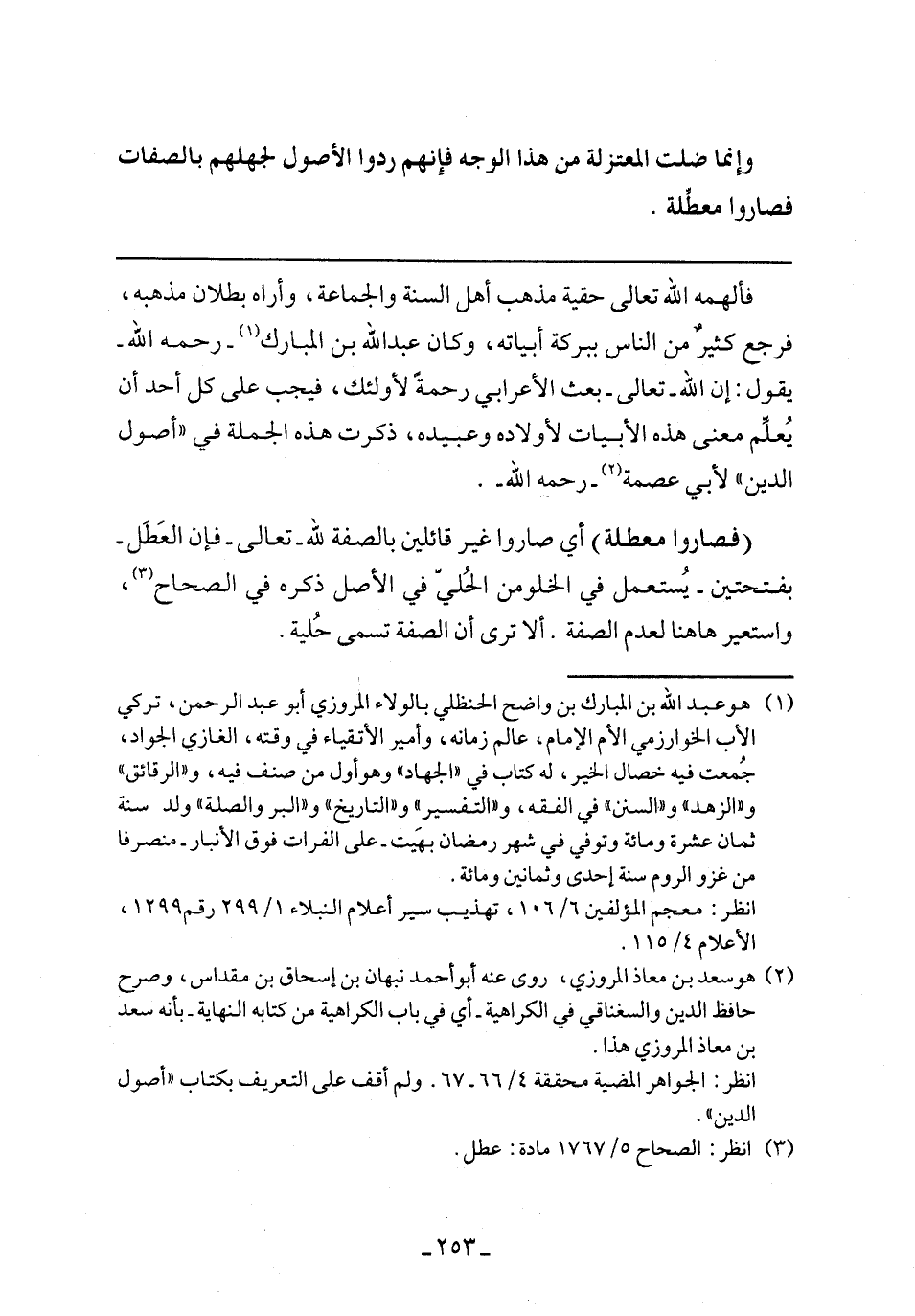 (فصاروا معطلة) أي صاروا غير قائلين بالصفة لله- تعالى- فإن العطل- بفتحتين- يستعمل في الخلو من الحلي في الأصل ذكره في الصحاح، واستعير ها هنا لعدم الصفة، ألا ترى أن الصفة تسمى حلية.