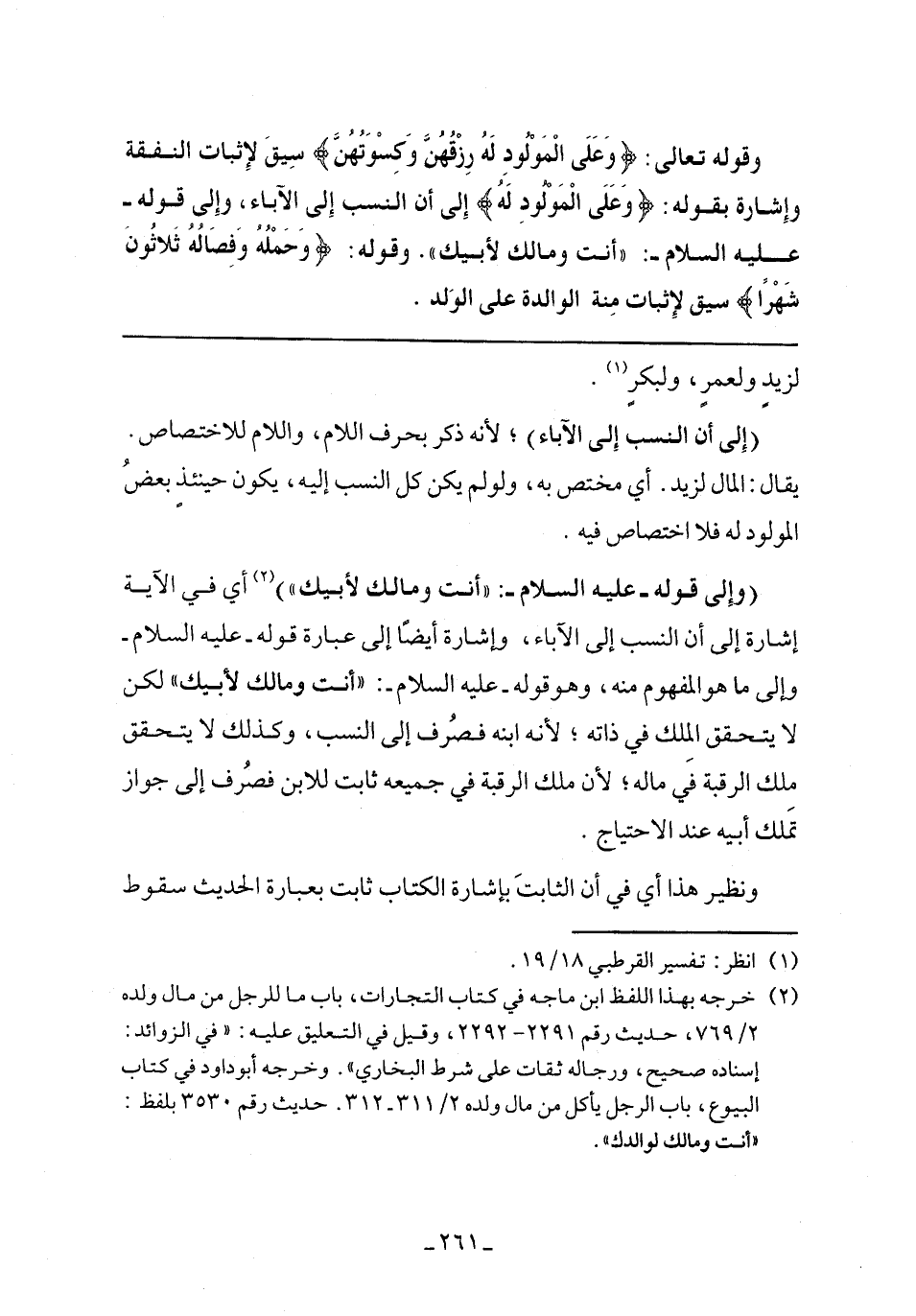 (وإلى قوله- عليه السلام- "أنت ومالك لأبيك") أي في الآية إشارة إلى أن النسب إلى الآباء، وإشارة أيضًا إلى عبارة قوله- عليه السلام- وإلى ما هو المفهوم منه، وهو قوله- عليه السلام-: "أنت ومالك لأبيك" لكن لا يتحقق الملك في ذاته؛ لأنه ابنه فصرف إلى النسب، وكذلك لا يتحقق ملك الرقبة في ماله؛ لأن ملك الرقبة في جميعه ثابت للابن فصرف إلى جواز تملك أبيه عند الاحتياج.