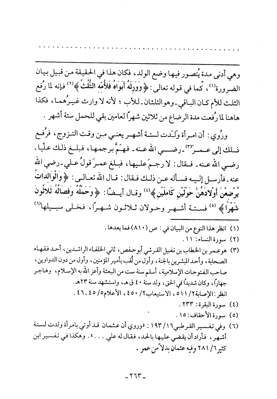 وروى: أن امرأة ولدت لستة أشهر يعني من وقت التزوج، فرفع ذلك إلى عمر- رضي الله عنه- فهم برجمها، فبلغ ذلك عليا- رضي الله عنه- فقال: لا رجم عليها، فبلغ عمر قول علي- رضي الله عنه- فأرسل إليه فسأله عن ذلك فقال: قال الله تعالى: {وَالْوَالِدَاتُ يُرْضِعْنَ أَوْلادَهُنَّ حَوْلَيْنِ كَامِلَيْنِ} وقال أيضًا: {وَحَمْلُهُ وَفِصَالُهُ ثَلاثُونَ شَهْرًا} فستة أشهر وحولان ثلاثون شهرًا، فخلى سبيلها