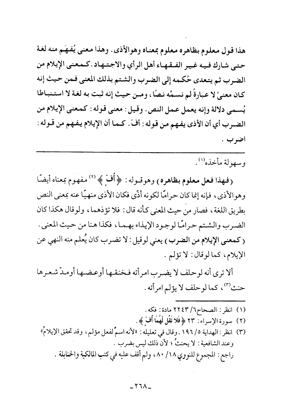 (فهذا فعل معلوم بظاهرة) وهو قوله: {أُفٍّ} مفهوم بمعناه أيضًا وهو الأذى، فإنه إنما كان حرامًا لكونه أذى فكان الأذى منهيًا عنه بمعنى النص بطريق اللغة، فصار من حيث المعنى كأنه قال: فلا تؤذهما، ولو قال هكذا كان الضرب والشتم حرامًا لوجود الإيذاء بهما، فكذا هنا من حيث المعنى. (كمعنى الإيلام من الضرب) يعنى لو قيل: لا تضرب كان يعلم منه النهي عن الإيلام، كما لو قال: لا تؤلم.