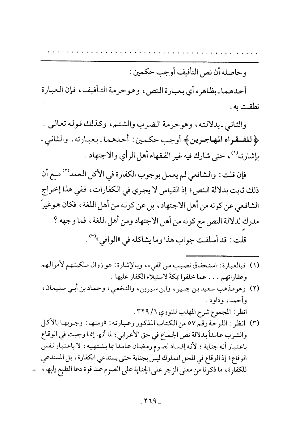 والثاني- بدلاته، وهو حرمة الضرب والشتم، وكذلك قوله تعالى: {لِلْفُقَرَاءِ الْمُهَاجِرِينَ} أوجب حكمين: أحدهما- بعبارته، والثاني- بإشارته، حتى شارك فيه غير الفقهاء أهل الرأي والاجتهاد.