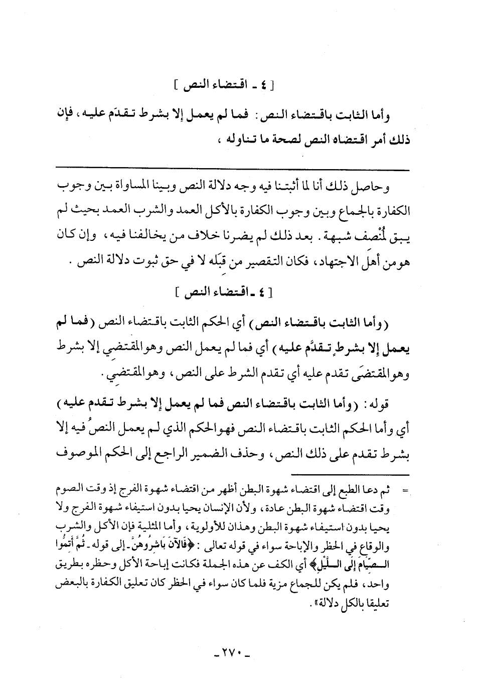 (وأما الثابت باقتضاء النص) أي الحكم الثابت باقتضاء النص (فما لم يعمل إلا بشرط تقدم عليه) أي فما لم يعمل النص وهو المقتضي إلا بشرط وهو المقتضي تقدم عليه أي تقدم اشرط على النص، وهو المقتضي.