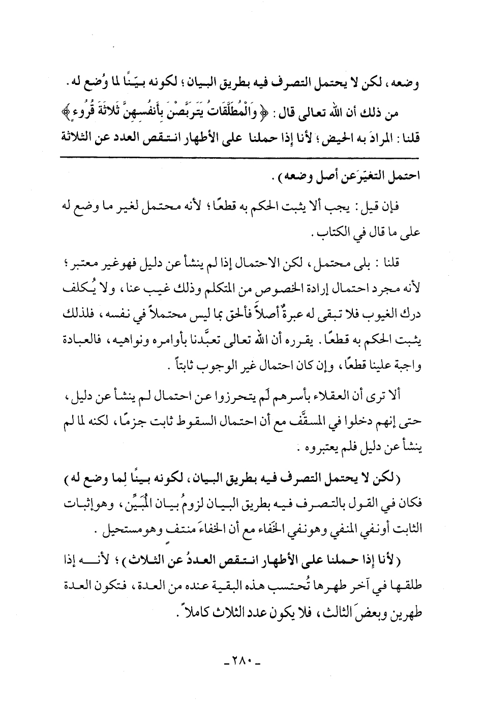 قلنا: بلى محتمل، لكن الاحتمال إذا لم ينشأ عن دليل فهو غير معتبر؛ لأنه مجرد احتمال إرادة الخصوص من المتكلم وذلك غيب عنا، ولا يكلف درك الغيوب فلا تبقى له عبرة أصلًا فألحق بما ليس محتملًا في نفسه، فلذلك يثبت الحكم به قطعًا. يقرره أن الله تعالى تعبدنا بأوامره ونواهيه، فالعبادة واجبة علينا قطعًا، وإن كان احتمال غير الوجوب ثابتًا.