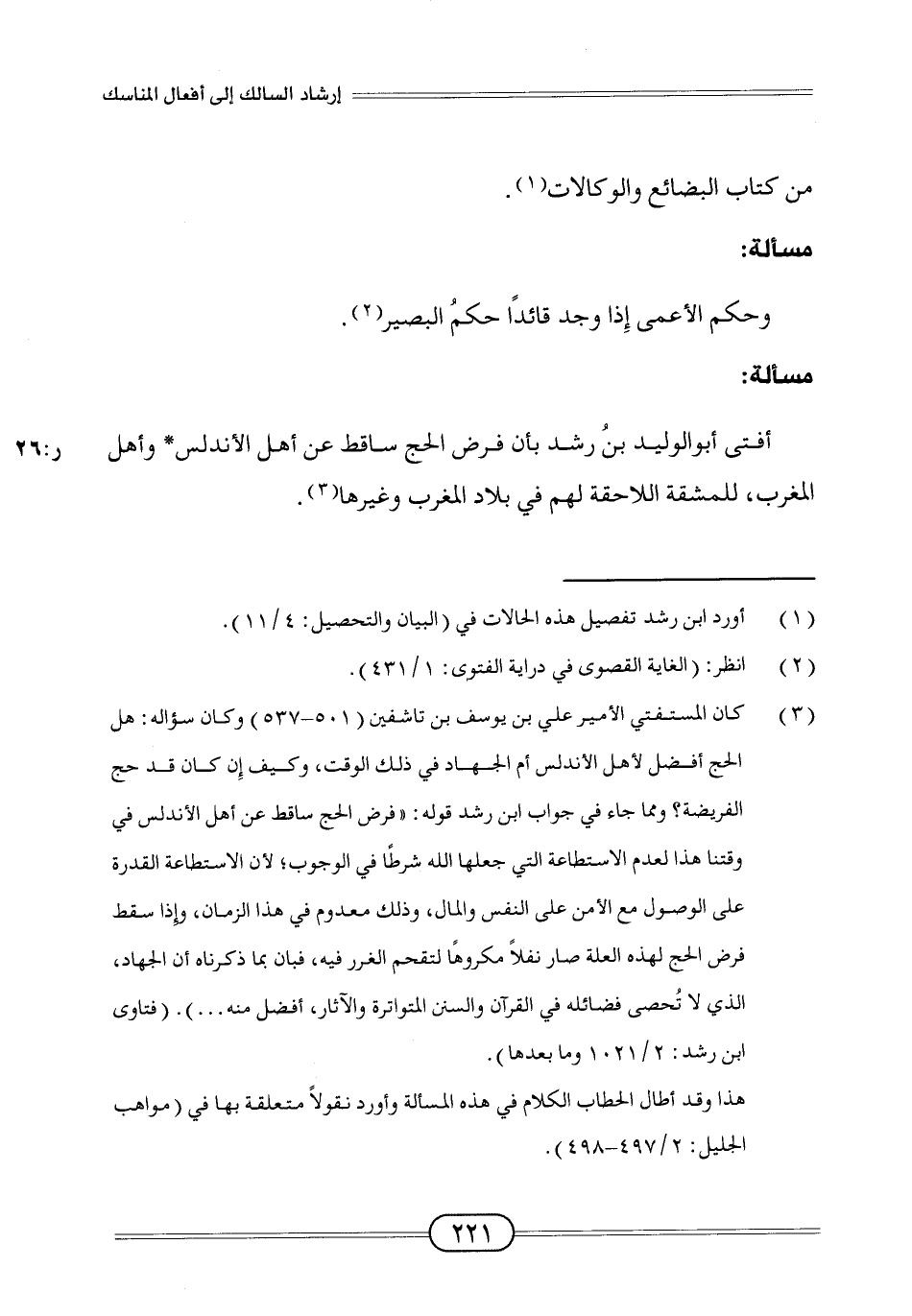 (¬3) كان المستفتي الأمير علي بن يوسف بن تاشفين (501 - 537) وكان سؤاله: هل الحج أفضل لأهل الأندلس أم الجهاد في ذلك الوقت، وكيف إِن كان قد حج الفريضة؟ ومما جاء في جواب ابن رشد قوله: "فرض الحج ساقط عن أهل الأندلس في وقتنا هذا لعدم الاستطاعة التي جعلها الله شرطًا في الوجوب؛ لأن الاستطاعة القدرة علي الوصول مع الأمن على النفس والمال، وذلك معدوم في هذا الزمان، وإذا سقط فرض الحج لهذه العلة صار نفلًا مكروهًا لتقحم الغرر فيه، فبان بما ذكرناه أن الجهاد، الذي لا تُحصى فضائله في القرآن والسنن المتواترة والآثار، أفضل منه ... ). (فتاوى ابن رشد: 2/ 1021 وما بعدها).