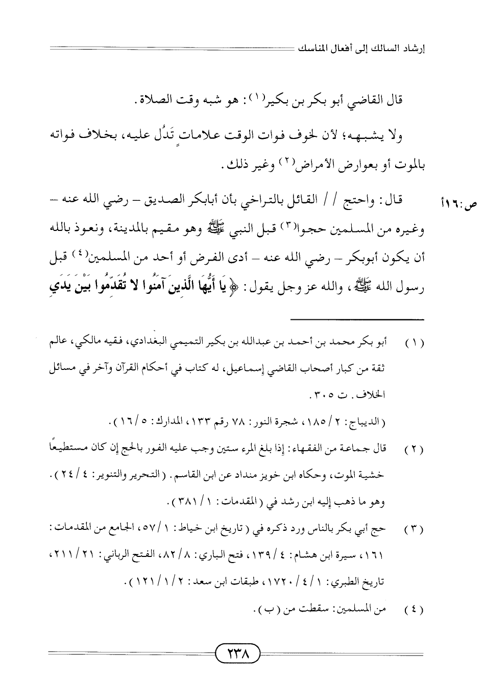 قال: واحتج القائل بالتراخي بأن أبا بكر الصديق - رضي الله عنه - وغيره من المسلمين حجوا (¬3) قبل النبي - صلى الله عليه وسلم - وهو مقيم بالمدينة، ونعوذ بالله أن يكون أبو بكر - رضي الله عنه - أدى الفرض أو أحد من المسلمين (¬4) قبل رسول الله - صلى الله عليه وسلم -، والله عز وجل يقول: {يَاأَيُّهَا الَّذِينَ آمَنُوا لَا تُقَدِّمُوا بَيْنَ يَدَيِ