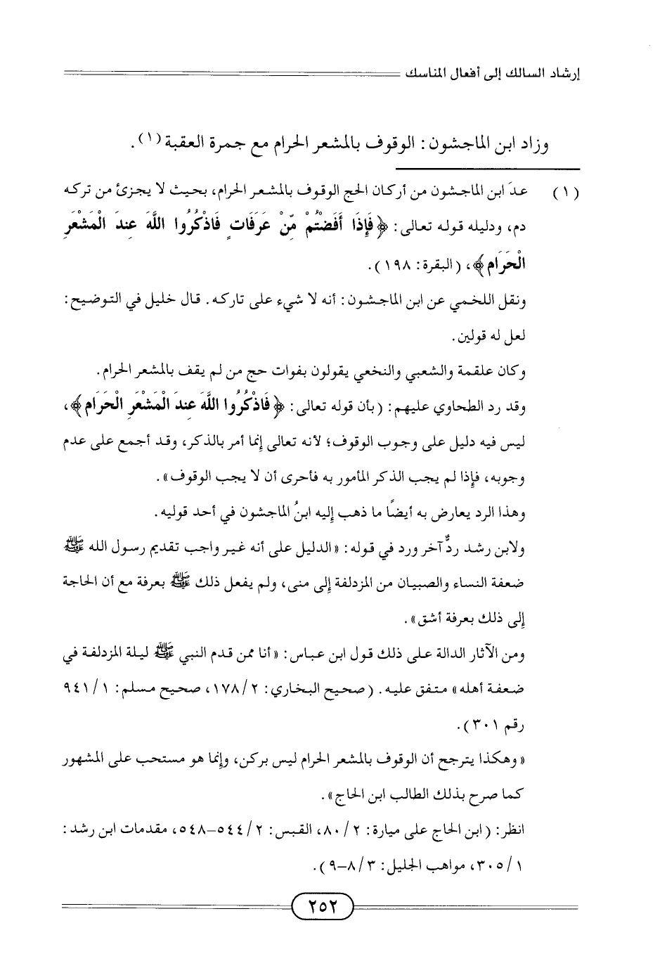 (¬1) عدَ ابن الماجشون من أركان الحج الوقوف بالمشعر الحرام، بحيث لا يجزئ من تركه دم، ودليله قوله تعالى: {فَإِذَا أَفَضْتُمْ مِنْ عَرَفَاتٍ فَاذْكُرُوا اللَّهَ عِنْدَ الْمَشْعَرِ الْحَرَامِ} [البقرة: 198].