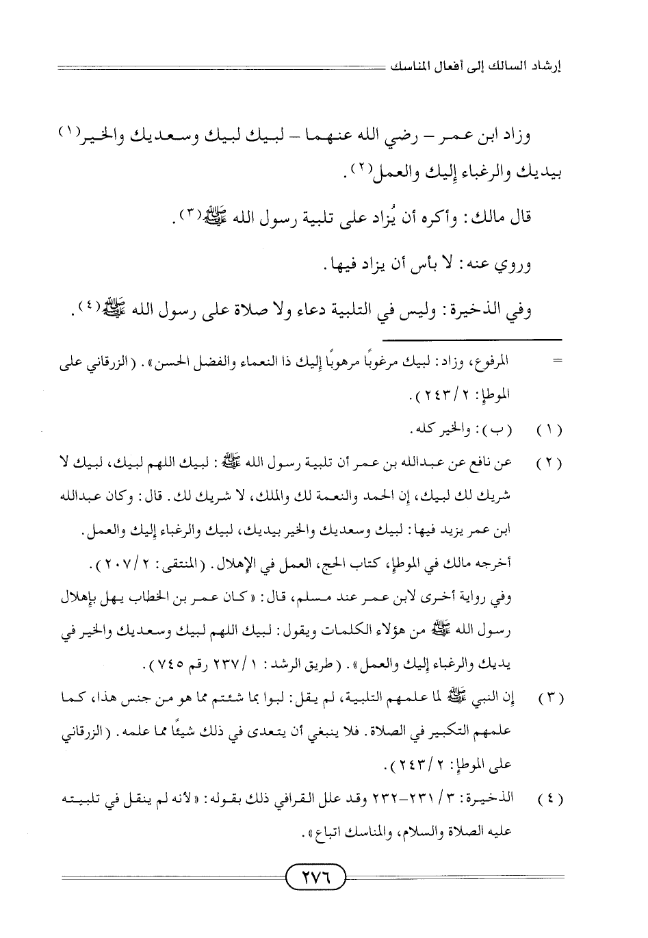 (¬4) الذخيرة: 3/ 231 - 232 وقد علل القرافي ذلك بقوله: "لأنه لم ينقل في تلبيته عليه الصلاة والسلام، والمناسك اتباع".