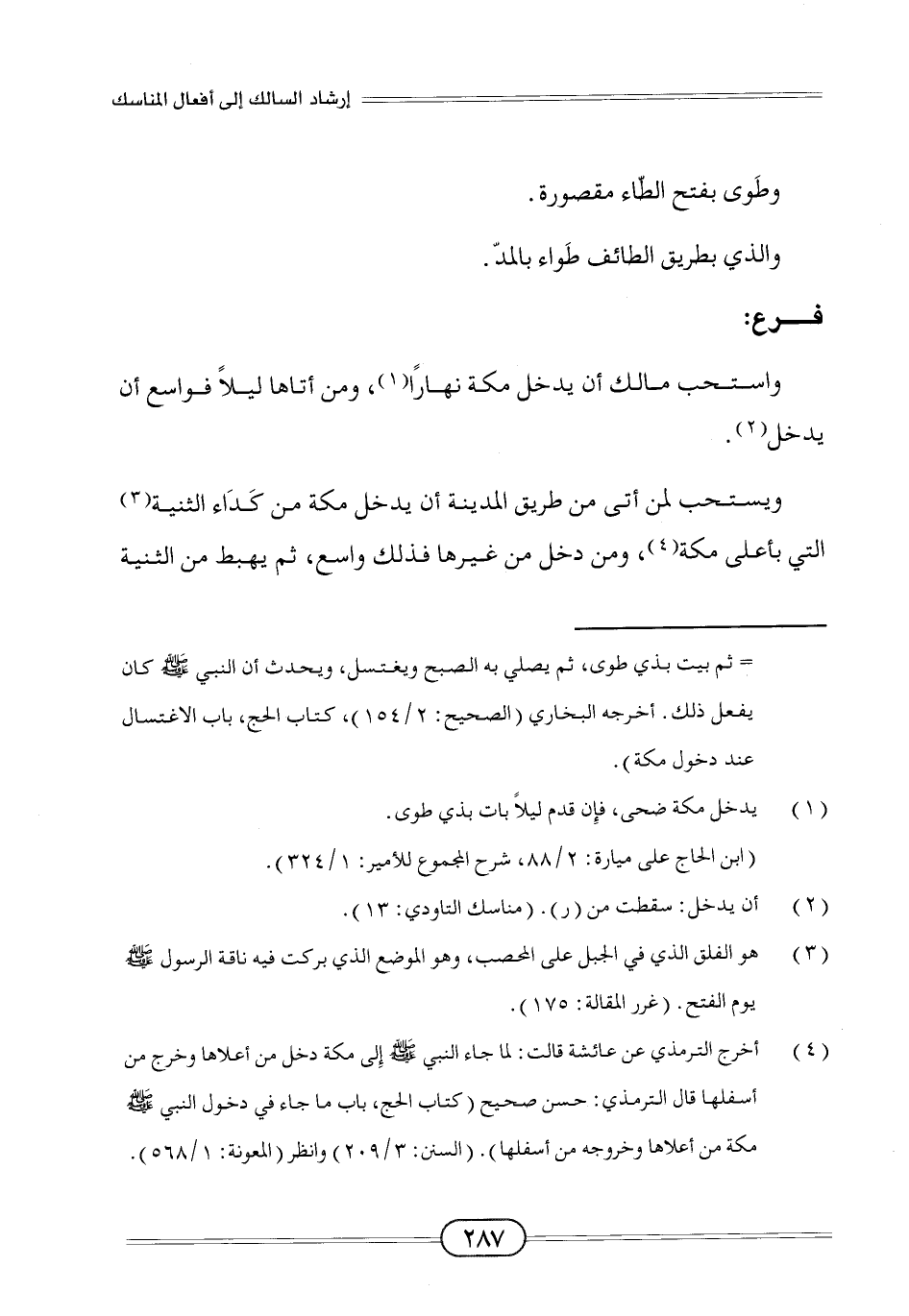 (¬4) أخرج الترمذي عن عائشة قالت: لما جاء النبي - صلى الله عليه وسلم - إِلى مكة دخل من أعلاها وخرج من أسفلها قال الترمذي: حسن صحيح (كتاب الحج، باب ما جاء في دخول النبي - صلى الله عليه وسلم - مكة من أعلاها وخروجه من أسفلها). (السنن: 3/ 209) وانظر (المعونة: 1/ 568).
