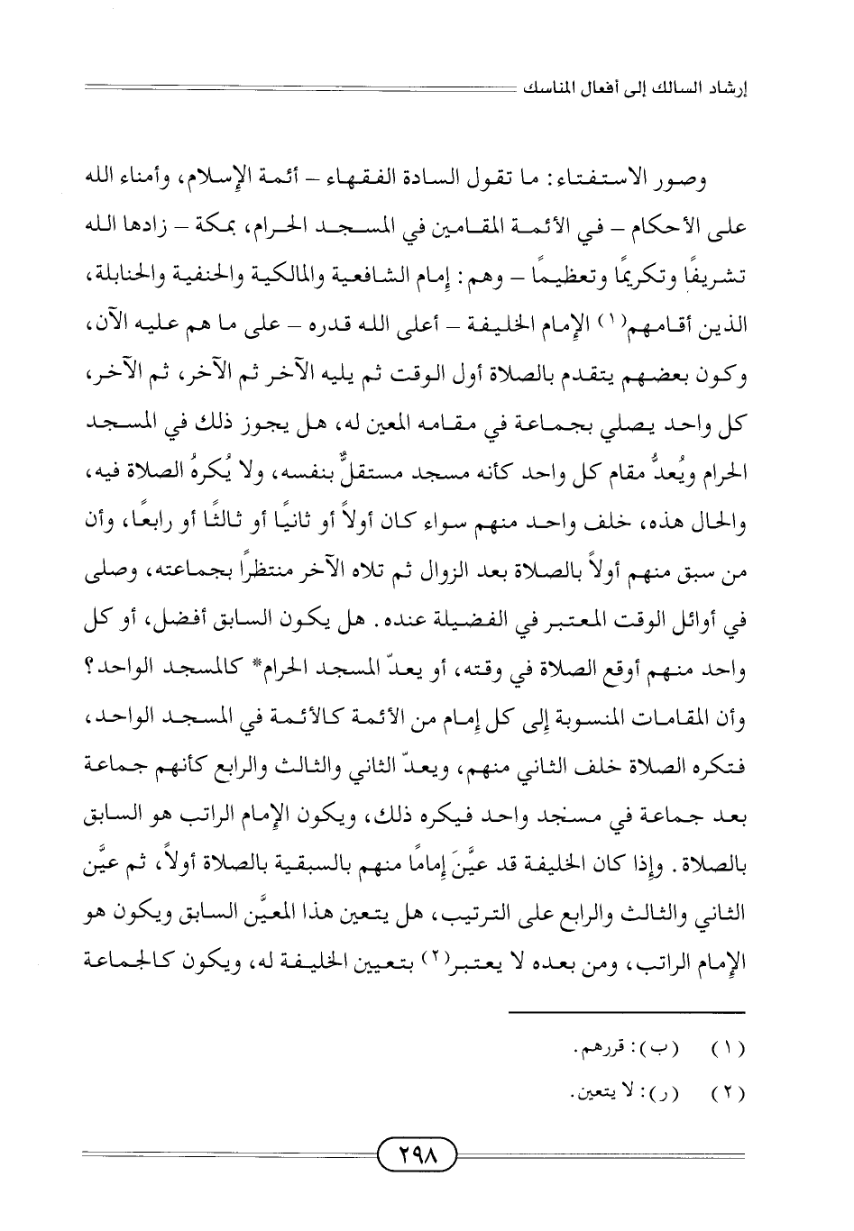 وصور الاستفتاء: ما تقول السادة الفقهاء - أئمة الإِسلام، وأمناء الله على الأحكام - في الأئمة المقامين في المسجد الحرام، بمكة - زادها الله تشريفًا وتكريمًا وتعظيمًا - وهم: إِمام الشافعية والمالكية والحنفية والحنابلة، الذين أقامهم (¬1) الإِمام الخليفة - أعلى الله قدره - على ما هم عليه الآن، وكون بعضهم يتقدم بالصلاة أول الوقت ثم يليه الآخر ثم الآخر، ثم الآخر، كل واحد يصلي بجماعة في مقامه المعين له، هل يجوز ذلك في المسجد الحرام ويُعدُّ مقام كل واحد كأنه مسجد مستقلٌّ بنفسه، ولا يُكرهُ الصلاة فيه، والحال هذه، خلف واحد منهم سواء كان أولًا أو ثانيًا أو ثالثًا أو رابعًا، وأن من سبق منهم أولًا بالصلاة بعد الزوال ثم تلاه الآخر منتظرًا بجماعته، وصلى في أوائل الوقت المعتبر في الفضيلة عنده. هل يكون السابق أفضل، أو كل واحد منهم أوقع الصلاة في وقته، أو يعدّ المسجد الحرام * كالمسجد الواحد؟ وأن المقامات المنسوبة إِلى كل إِمام من الأئمة كالأئمة في المسجد الواحد، فتكره الصلاة خلف الثاني منهم، ويعدّ الثاني والثالث والرابع كأنهم جماعة بعد جماعة في مسجد واحد فيكره ذلك، ويكون الإِمام الراتب هو السابق بالصلاة. وإِذا كان الخليفة قد عيَّنَ إِمامًا منهم بالسبقية بالصلاة أولًا، ثم عيَّن الثاني والثالث والرابع على الترتيب، هل يتعين هذا المعيَّن السابق ويكون هو الإِمام الراتب، ومن بعده لا يعتبر (¬2) بتعيين الخليفة له، ويكون كالجماعة