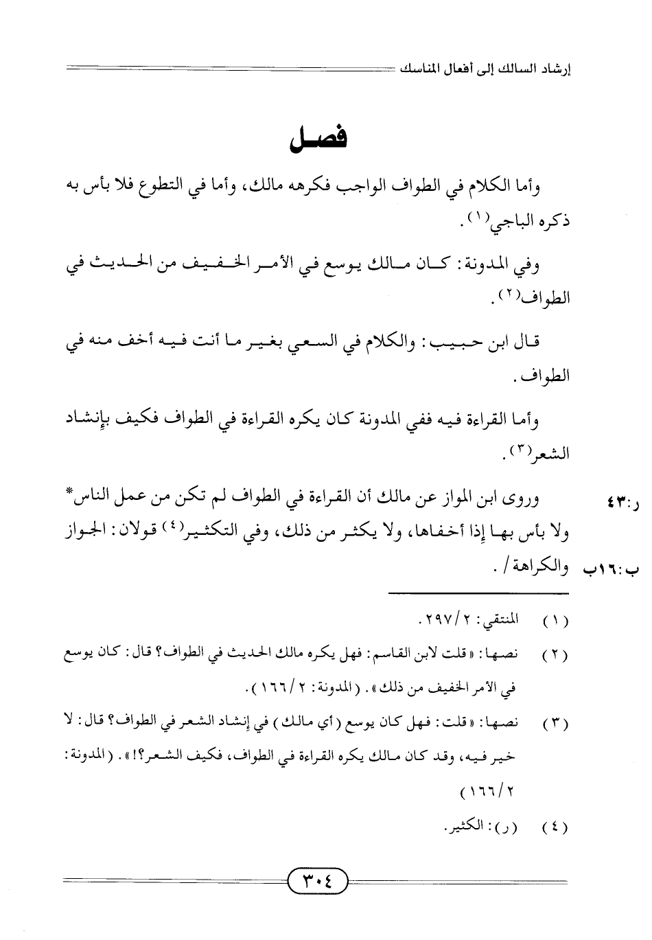 (¬3) نصها: "قلت: فهل كان يوسع (أي مالك) في إِنشاد الشعر في الطواف؟ قال: لا خير فيه، وقد كان مالك يكره القراءة في الطواف، فكيف الشعر؟ ! ". (المدونة: 2/ 166)