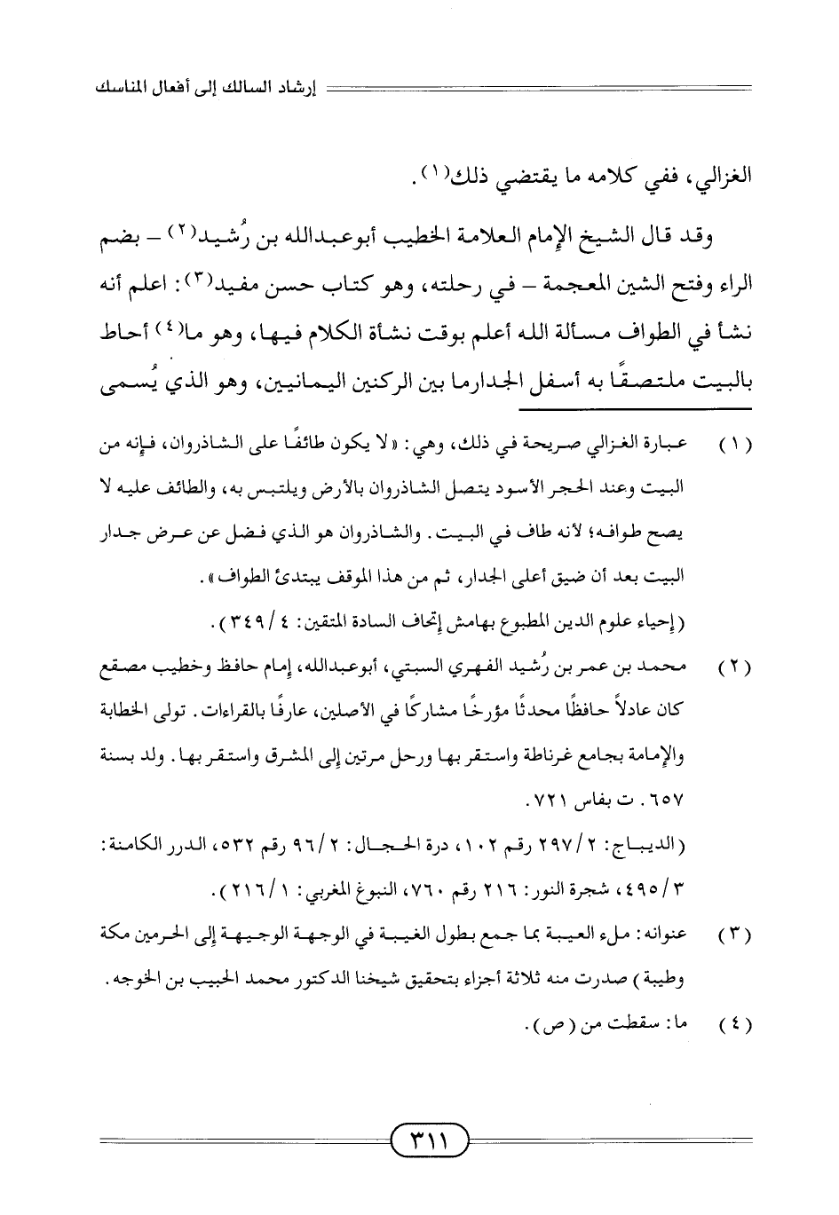 (¬1) عبارة الغزالي صريحة في ذلك، وهي: "لا يكون طائفًا على الشاذروان، فإِنه من البيت وعند الحجر الأسود يتصل الشاذروان بالأرض ويلتبس به، والطائف عليه لا يصح طوافه؛ لأنه طاف في البيت. والشاذروان هو الذي فضل عن عرض جدار البيت بعد أن ضيق أعلى الجدار، ثم من هذا الموقف يبتدئ الطواف".