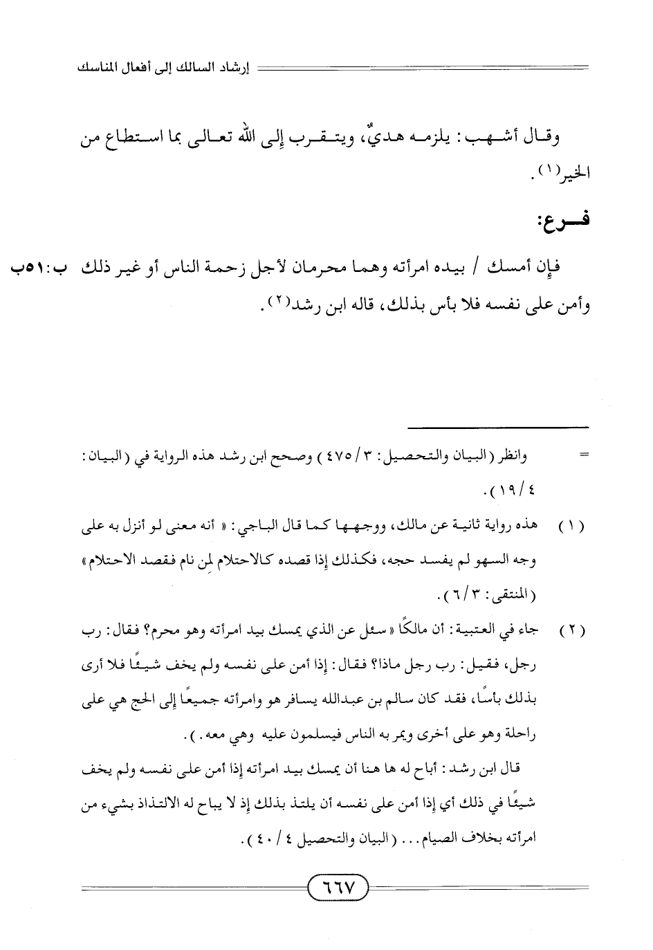 (¬2) جاء في العتبية: أن مالكًا "سئل عن الذي يمسك بيد امرأته وهو محرم؟ فقال: رب رجل، فقيل: رب رجل ماذا؟ فقال: إِذا أمن على نفسه ولم يخف شيئًا فلا أرى بذلك بأسًا، فقد كان سالم بن عبد الله يسافر هو وامرأته جميعًا إِلى الحج هي على راحلة وهو على أخرى ويمر به الناس فيسلمون عليه وهي معه).