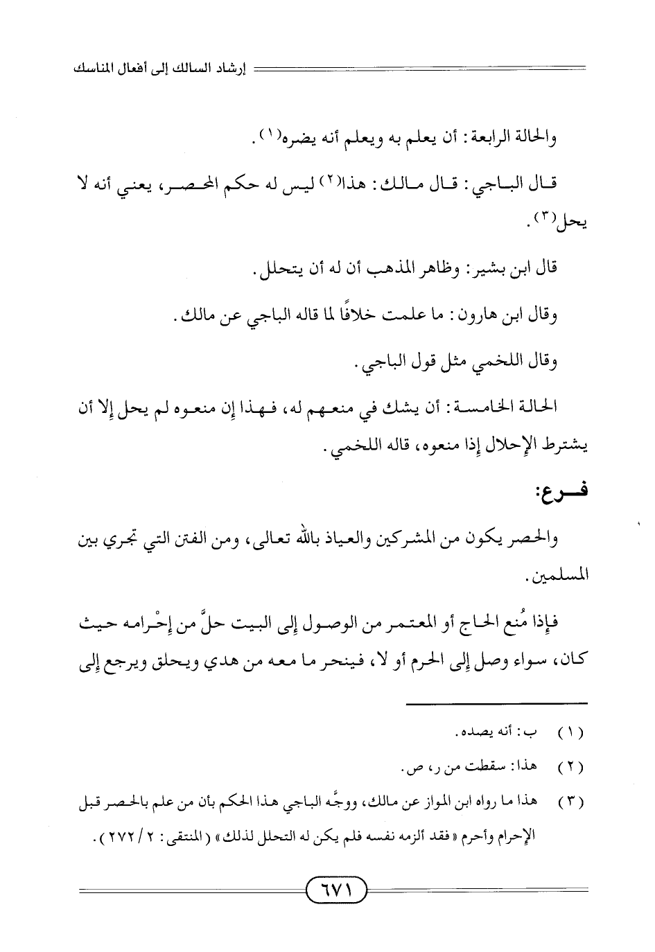 (¬3) هذا ما رواه ابن المواز عن مالك، ووجَّه الباجي هذا الحكم بأن من علم بالحصر قبل الإِحرام وأحرم "فقد ألزمه نفسه فلم يكن له التحلل لذلك" (المنتقى: 2/ 272).