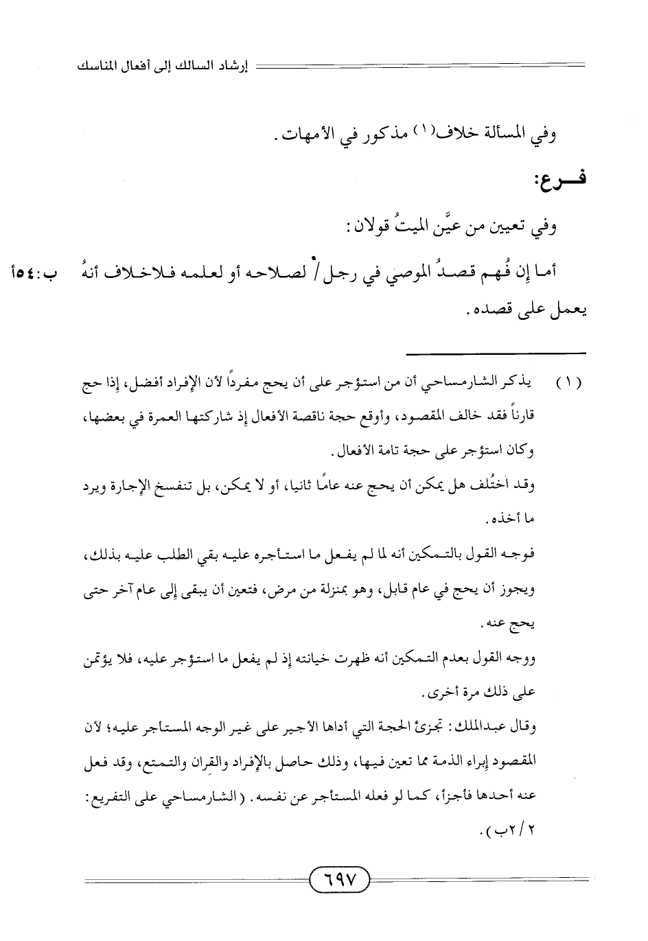 (¬1) يذكر الشارمساحي أن من استؤجر على أن يحج مفردًا لأن الإِفراد أفضل، إِذا حج قارنًا فقد خالف المقصود، وأوقع حجة ناقصة الأفعال إِذ شاركتها العمرة في بعضها، وكان استؤجر على حجة تامة الأفعال.