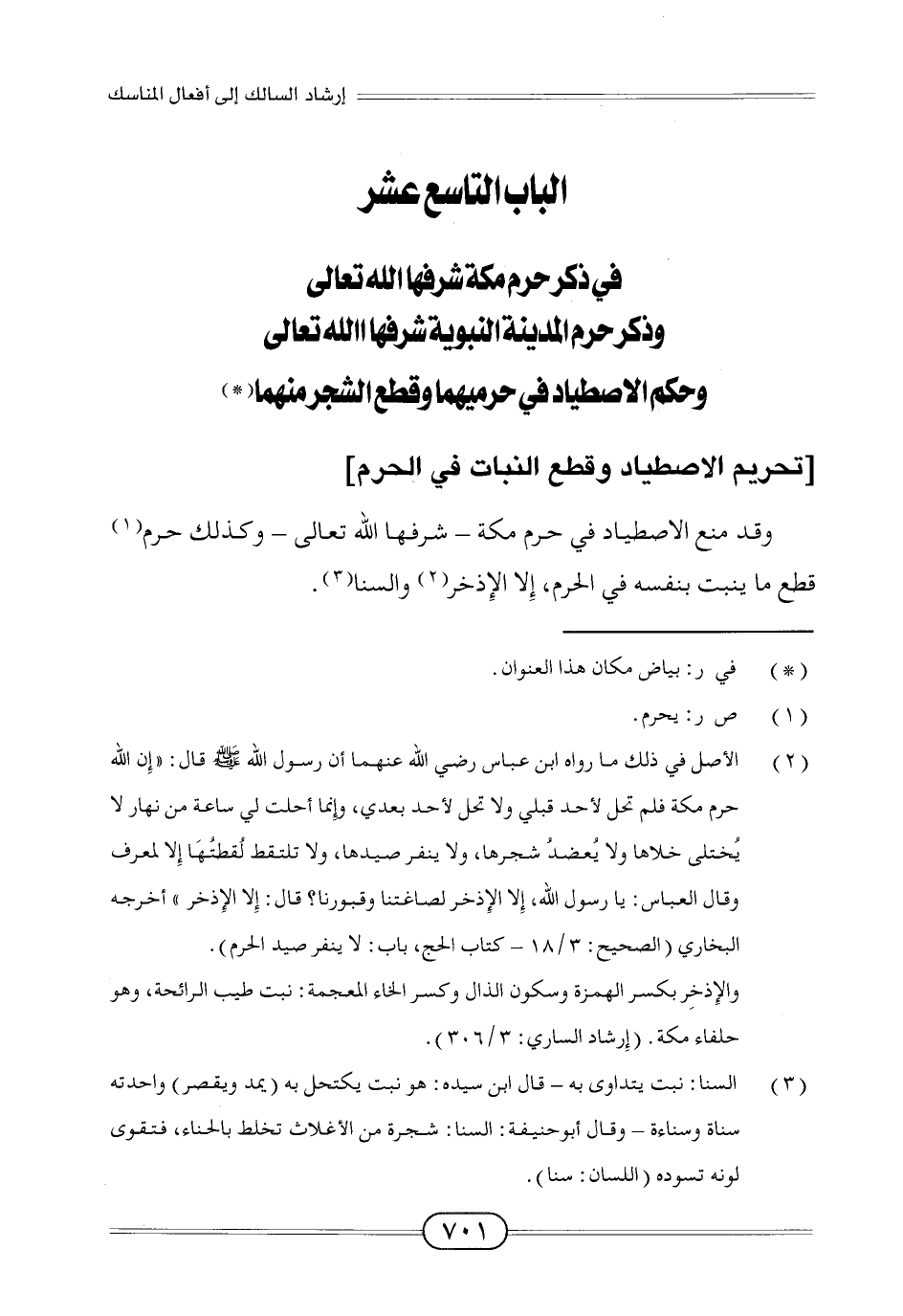 (¬2) الأصل في ذلك ما رواه ابن عباس رضي الله عنهما أن رسول الله - صلى الله عليه وسلم - قال: "إِن الله حرم مكة فلم تحل لأحد قبلي ولا تحل لأحد بعدي، وإِنما أحلت لي ساعة من نهار لا يُختلى خلاها ولا يُعضدُ شجرها، ولا ينفر صيدها، ولا تلتقط لُقطتُهَا إِلا لمعرف وقال العباس: يا رسول الله، إِلا الإِذخر لصاغتنا وقبورنا؟ قال: إِلا الإِذخر" أخرجه البخاري (الصحيح: 3/ 18 - كتاب الحج، باب: لا ينفر صيد الحرم).