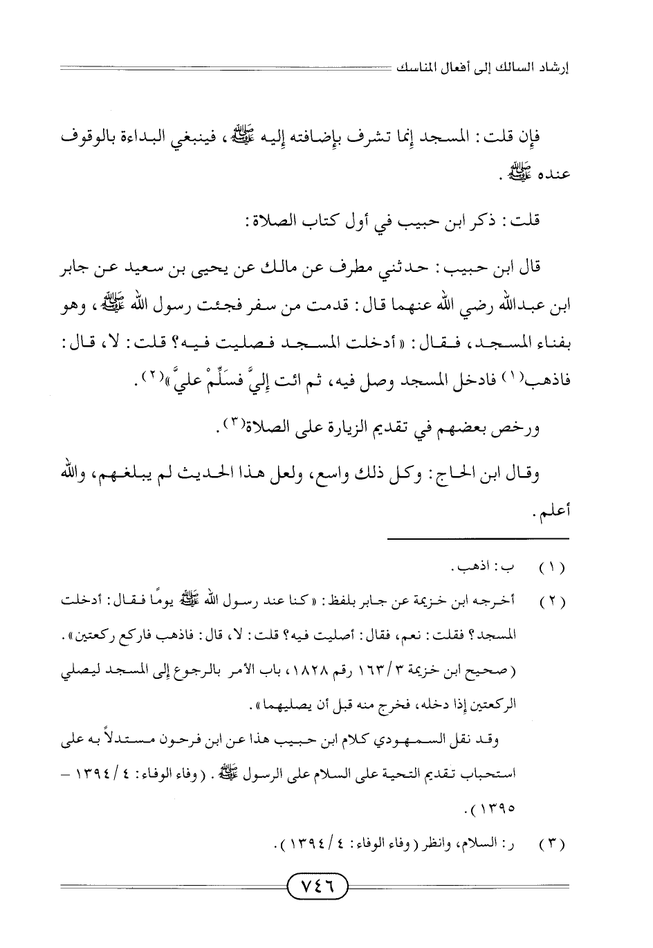 وقد نقل السمهودي كلام ابن حبيب هذا عن ابن فرحون مستدلًا به على استحباب تقديم التحية على السلام على الرسول - صلى الله عليه وسلم -. (وفاء الوفاء: 4/ 1394 - 1395).