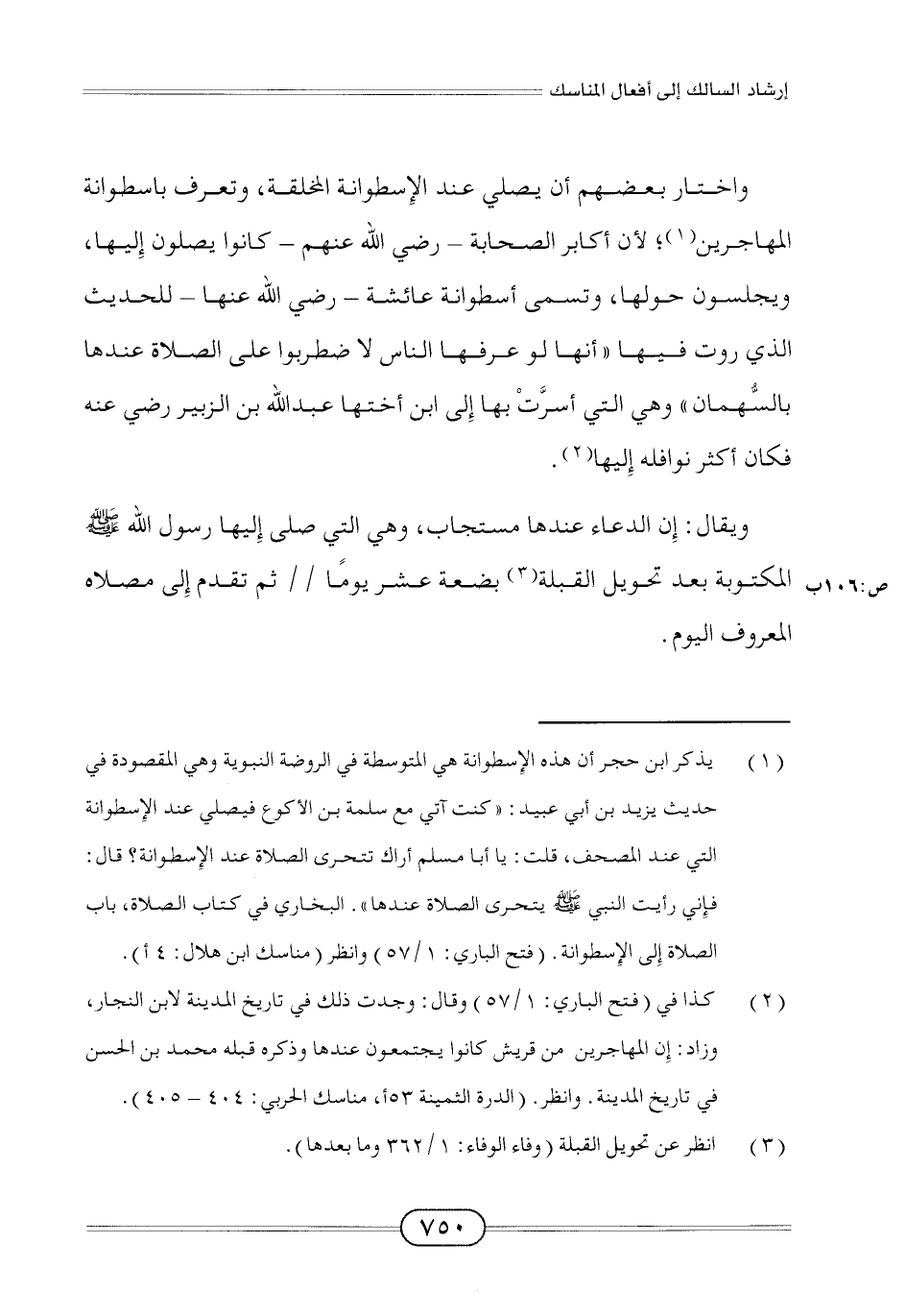 (¬1) يذكر ابن حجر أن هذه الإِسطوانة هي المتوسطة في الروضة النبوية وهي المقصودة في حديث يزيد بن أبي عبيد: "كنت آتي مع سلمة بن الأكوع فيصلي عند الإِسطوانة التي عند المصحف، قلت: يا أبا مسلم أراك تتحرى الصلاة عند الإِسطوانة؟ قال: فإِني رأيت النبي - صلى الله عليه وسلم - يتحرى الصلاة عندها". البخاري في كتاب الصلاة، باب الصلاة إِلى الإسطوانة. (فتح الباري: 1/ 57) وانظر (مناسك ابن هلال: 4 أ).
