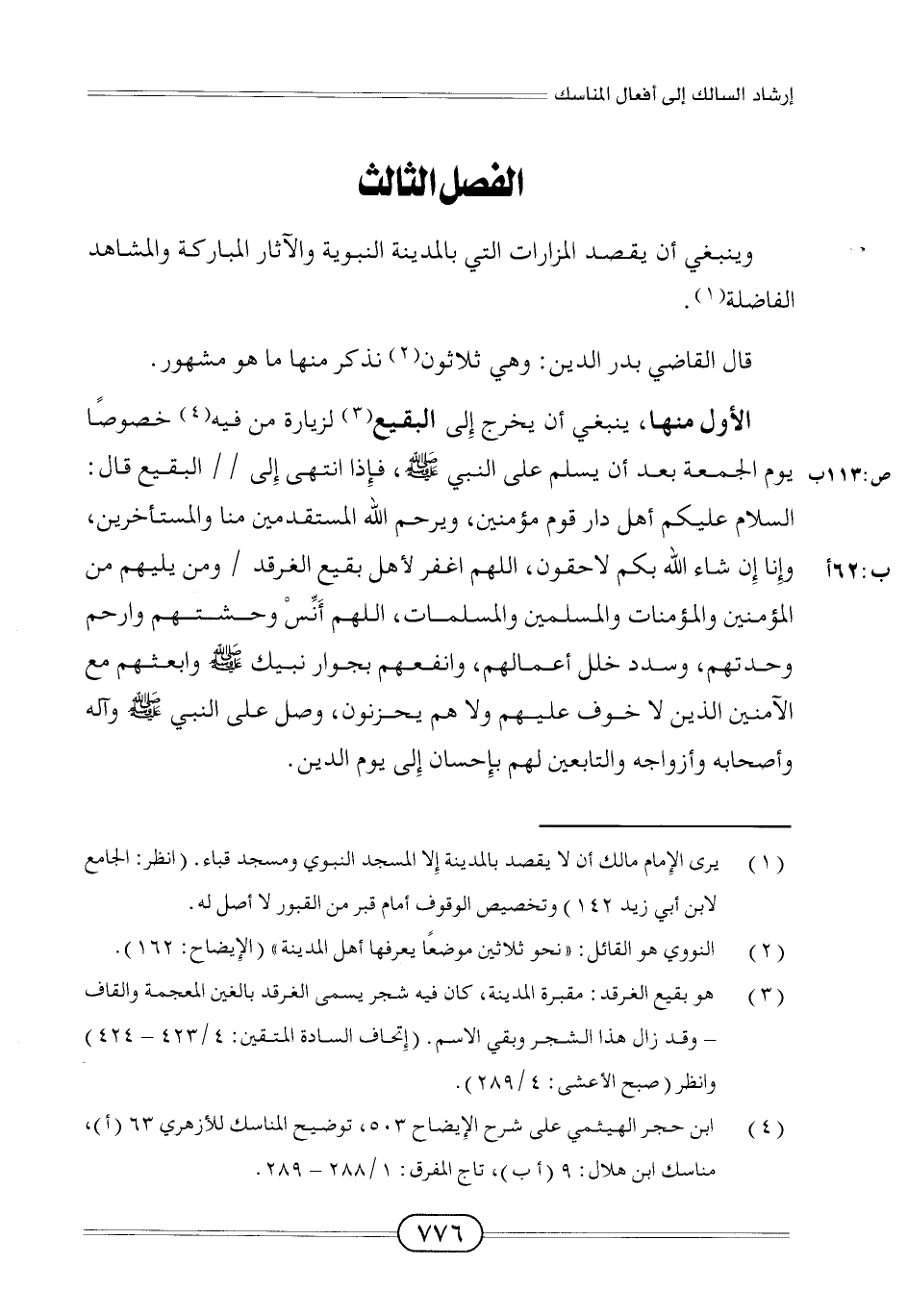 (¬1) يرى الإِمام مالك أن لا يقصد بالمدينة إِلا المسجد النبوي ومسجد قباء. (انظر: الجامع لابن أبي زيد 142) وتخصيص الوقوف أمام قبر من القبور لا أصل له.