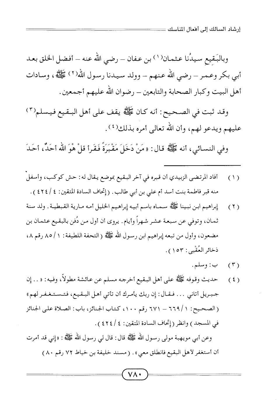 (¬4) حديث وقوفه - صلى الله عليه وسلم - على أهل البقيع أخرجه مسلم عن عائشة مطولًا، وفيه: " .. إِن جبريل أتاني ... فقال: إِن ربك يأمرك أن تأتي أهل البقيع، فتستغفر لهم" (الصحيح: 1/ 669 - 671 رقم 100، كتاب الجنائز، باب: الصلاة على الجنائز في المسجد) وانظر (إِتحاف السادة المتقين: 4/ 424).