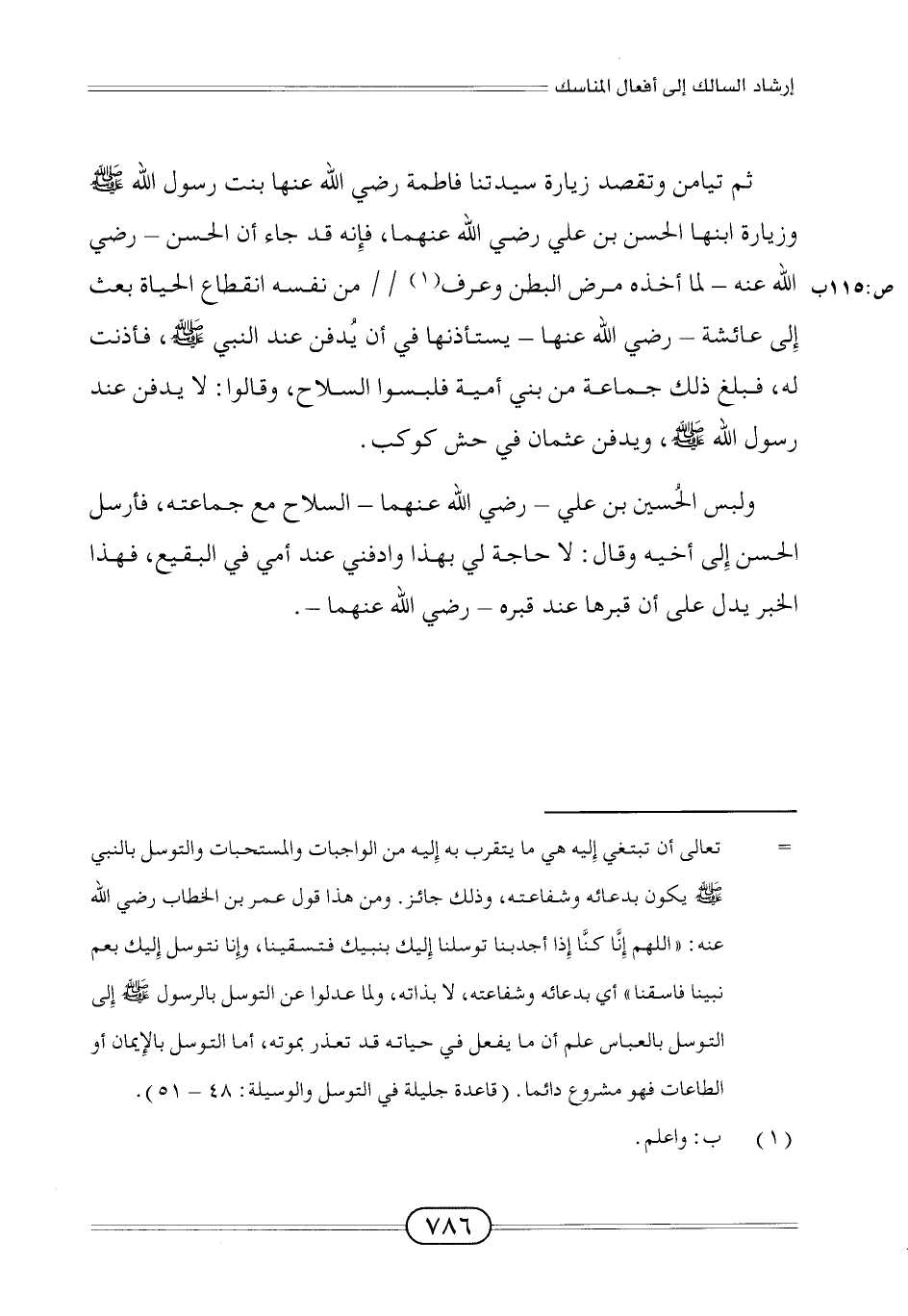 ثم تيامن وتقصد زيارة سيدتنا فاطمة رضي الله عنها بنت رسول الله - صلى الله عليه وسلم - وزيارة ابنها الحسن بن علي رضي الله عنهما، فإِنه قد جاء أن الحسن - رضي الله عنه - لما أخذه مرض البطن وعرف (¬1) من نفسه انقطاع الحياة بعث إِلى عائشة - رضي الله عنها - يستأذنها في أن يُدفن عند النبي - صلى الله عليه وسلم -، فأذنت له، فبلغ ذلك جماعة من بني أمية فلبسوا السلاح، وقالوا: لا يدفن عند رسول الله - صلى الله عليه وسلم -، ويدفن عثمان في حش كوكب.