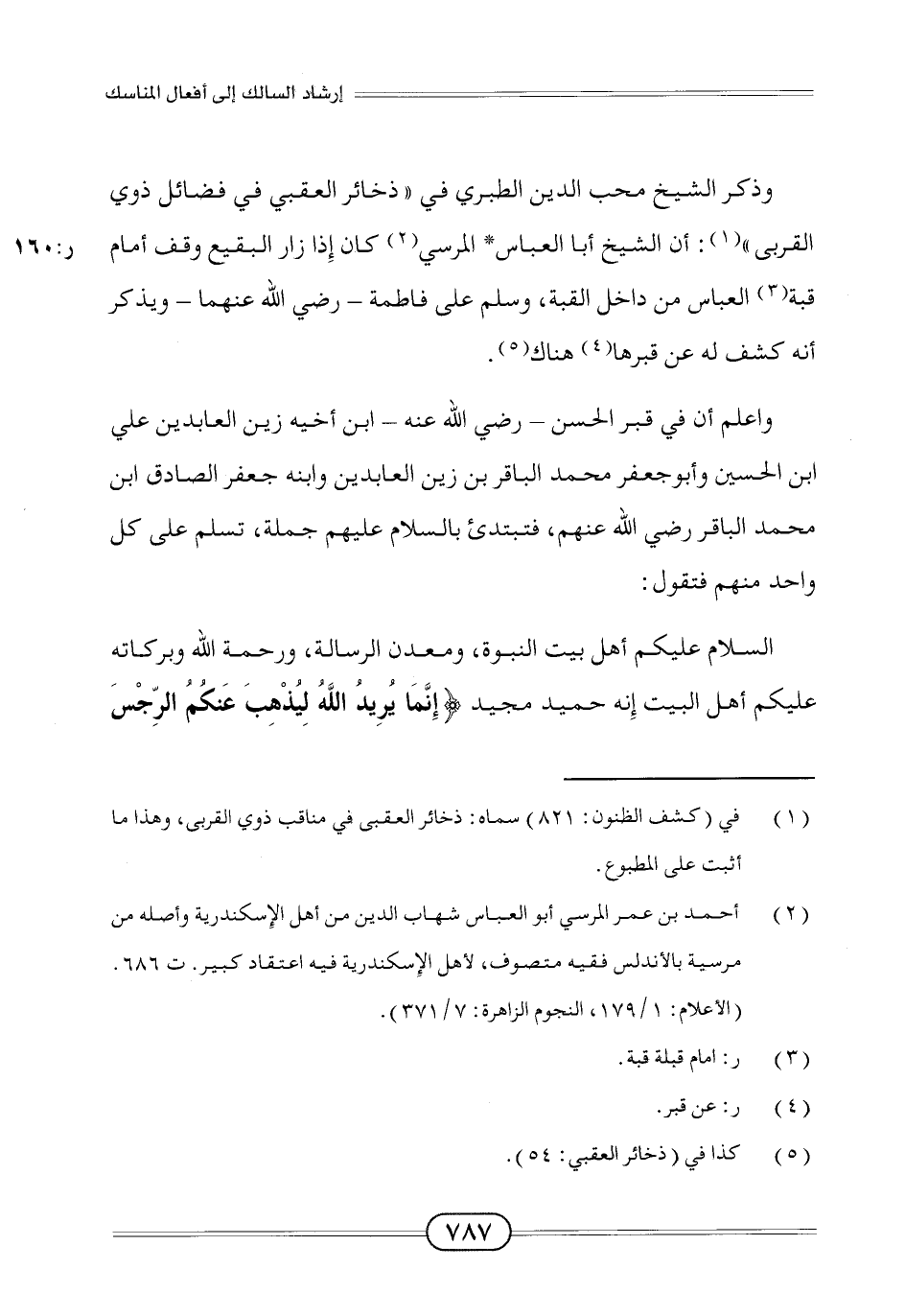 وذكر الشيخ محب الدين الطبري في "ذخائر العقبي في فضائل ذوي القربى" (¬1): أن الشيخ أبا العباس * المرسي (¬2) كان إِذا زار البقيع وقف أمام قبة (¬3) العباس من داخل القبة، وسلم على فاطمة - رضي الله عنهما - ويذكر أنه كشف له عن قبرها (¬4) هناك (¬5).