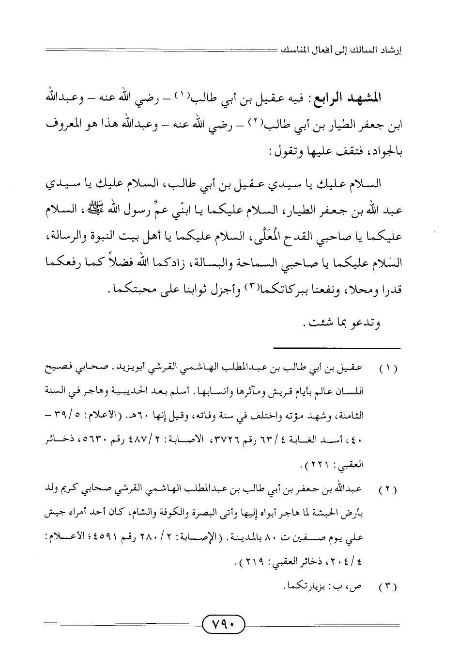السلام عليك يا سيدي عقيل بن أبي طالب، السلام عليك يا سيدي عبد الله بن جعفر الطيار، السلام عليكما يا ابنّي عمِّ رسول الله - صلى الله عليه وسلم -، السلام عليكما يا صاحبي القدح المُعَلَّى، السلام عليكما يا أهل بيت النبوة والرسالة، السلام عليكما يا صاحبي السماحة والبسالة، زادكما الله فضلًا كما رفعكما قدرا ومحلا، ونفعنا ببركاتكما (¬3) وأجزل ثوابنا على محبتكما.
