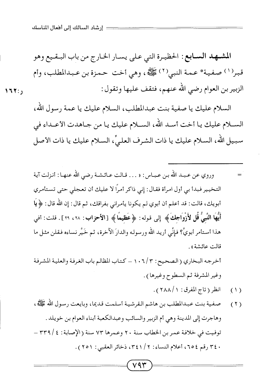 المشهد السابع: الحظيرة التي على يسار الخارج من باب البقيع وهو قبر (¬1) صفية * في عمة النبي (¬2) - صلى الله عليه وسلم -، وهي أخت حمضة بن عبد المطلب وأم الزبير بن العوام رضي الله عنهم، فتقف عليها وتقول: