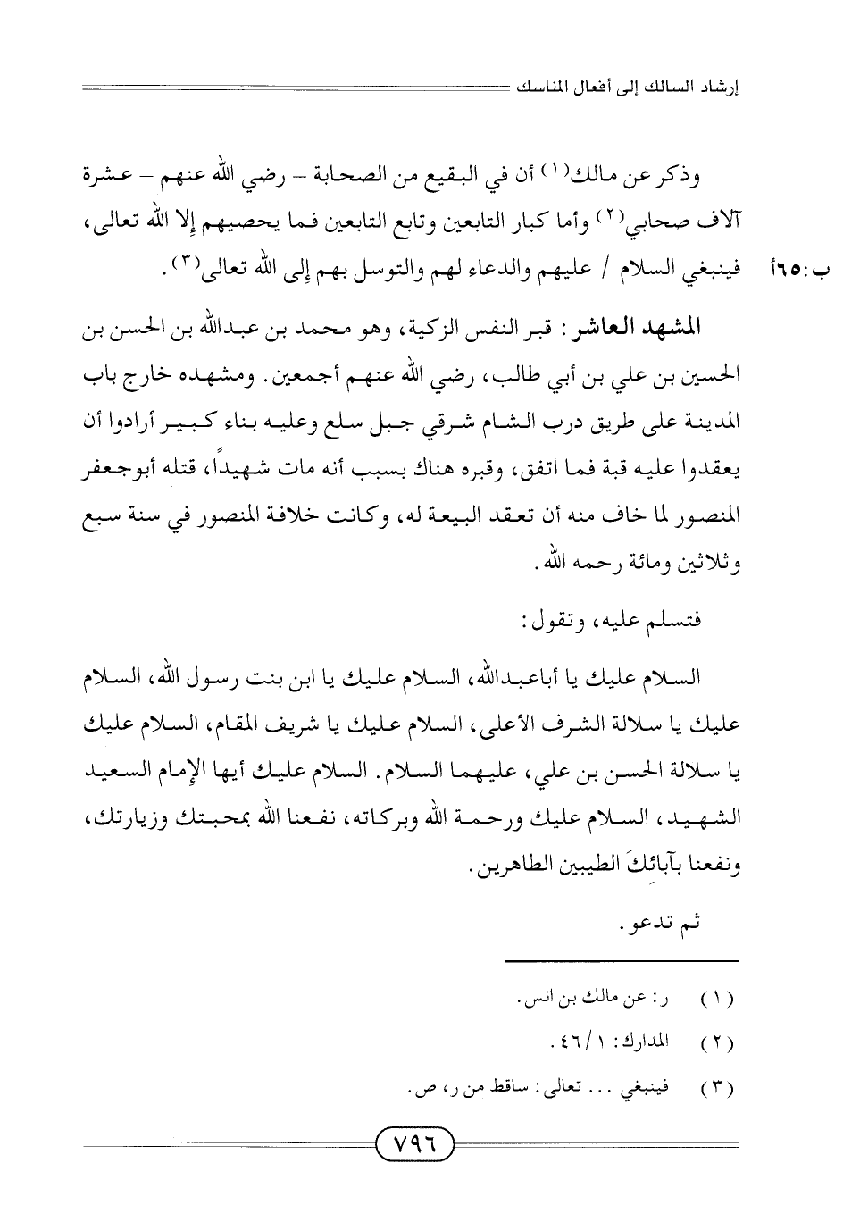 وذكر عن مالك (¬1) أن في البقيع من الصحابة - رضي الله عنهم - عشرة آلاف صحابي (¬2) وأما كبار التابعين وتابع التابعين فما يحصيهم إِلا الله تعالى، فينبغي السلام عليهم والدعاء لهم والتوسل بهم إِلى الله تعالى (¬3).