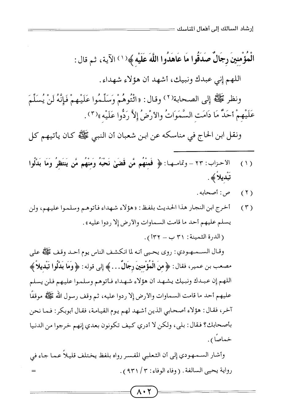 وقال السمهودي: روى يحيى أنه لما انكشف الناس يوم أحد وقف - صلى الله عليه وسلم - على مصعب بن عمير، فقال: {مِنَ الْمُؤْمِنِينَ رِجَالٌ ... } إِلى قوله: {وَمَا بَدَّلُوا تَبْدِيلًا} اللهم إِن عبدك ونبيك يشهد أن هؤلاء شهداء فأتوهم وسلموا عليهم فلن يسلم عليهم أحد ما قامت السماوات والأرض إِلا ردوا عليه، ثم وقف رسول الله - صلى الله عليه وسلم - موقفًا آخر، فقال: هؤلاء أصحابي الذين أشهد لهم يوم القيامة، فقال أبو بكر: فما نحن بأصحابك؟ فقال: بلى، ولكن لا أدري كيف تكونون بعدي إِنهم خرجوا من الدنيا خماصًا).