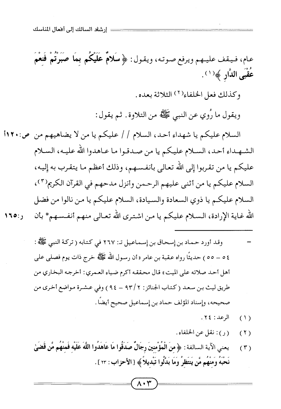 السلام عليكم يا شهداء أحد، السلام عليكم يا من لا يضاهيهم من الشهداء أحد، السلام عليكم يا من صدقوا ما عاهدوا الله عليه، السلام عليكم يا من تقربوا إِلى الله تعالى بأنفسهم، وذلك أعظم ما يتقرب به إِليه، السلام عليكم يا من أثنى عليهم الرحمن وأنزل مدحهم في القرآن الكريم (¬3)، السلام عليكم يا ذوي السعادة والسيادة، السلام عليكم يا من نالوا من فضل الله غاية الإِرادة، السلام عليكم يا من اشترى الله تعالى منهم أنفسهم * بأن