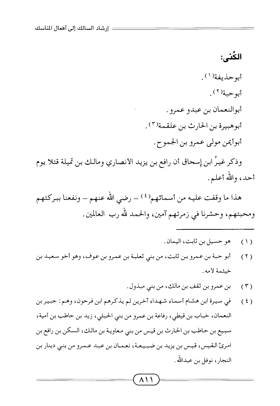 (¬4) في سيرة ابن هشام أسماء شهداء آخرين لم يذكرهم ابن فرحون، وهم: جبير بن النعمان، خباب بن قيطي، رفاعة بن عمرو من بني الحبلي، زيد بن حاطب بن أمية، سبيع بن حاطب بن الحارث بن قيس من بني معاوية بن مالك، السكن بن رافع بن امرئ القيس، قيس بن يزيد بن ضبيعة، نعمان بن عبد عمرو من بني دينار بن النجار، نوفل بن عبد الله.