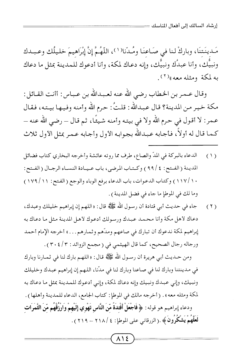 (¬2) جاء في حديث أبي قتادة أن رسول الله - صلى الله عليه وسلم - قال: "اللهم إِن إِبراهيم خليلك وعبدك، دعاك لأهل مكة وأنا محمد عبدك ورسولك أدعوك لأهل المدينة مثل ما دعاك به إِبراهيم لمكة ندعوك أن تبارك في صاعهم ومدّهم وثمارهم ... " أخرجه الإِمام أحمد ورجاله رجال الصحيح، كما قال الهيثمي في (مجمع الزوائد: 3/ 304).