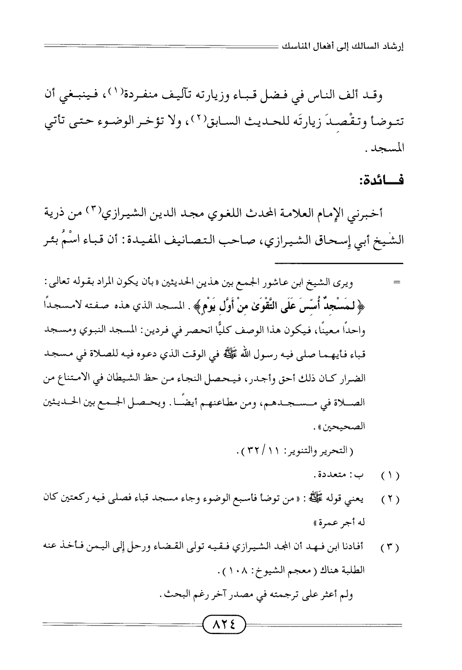 أخبرني الإِمام العلامة المحدث اللغوي مجد الدين الشيرازي (¬3) من ذرية الشيخ أبي إِسحاق الشيرازي، صاحب التصانيف المفيدة: أن قباء اسْمُ بئر