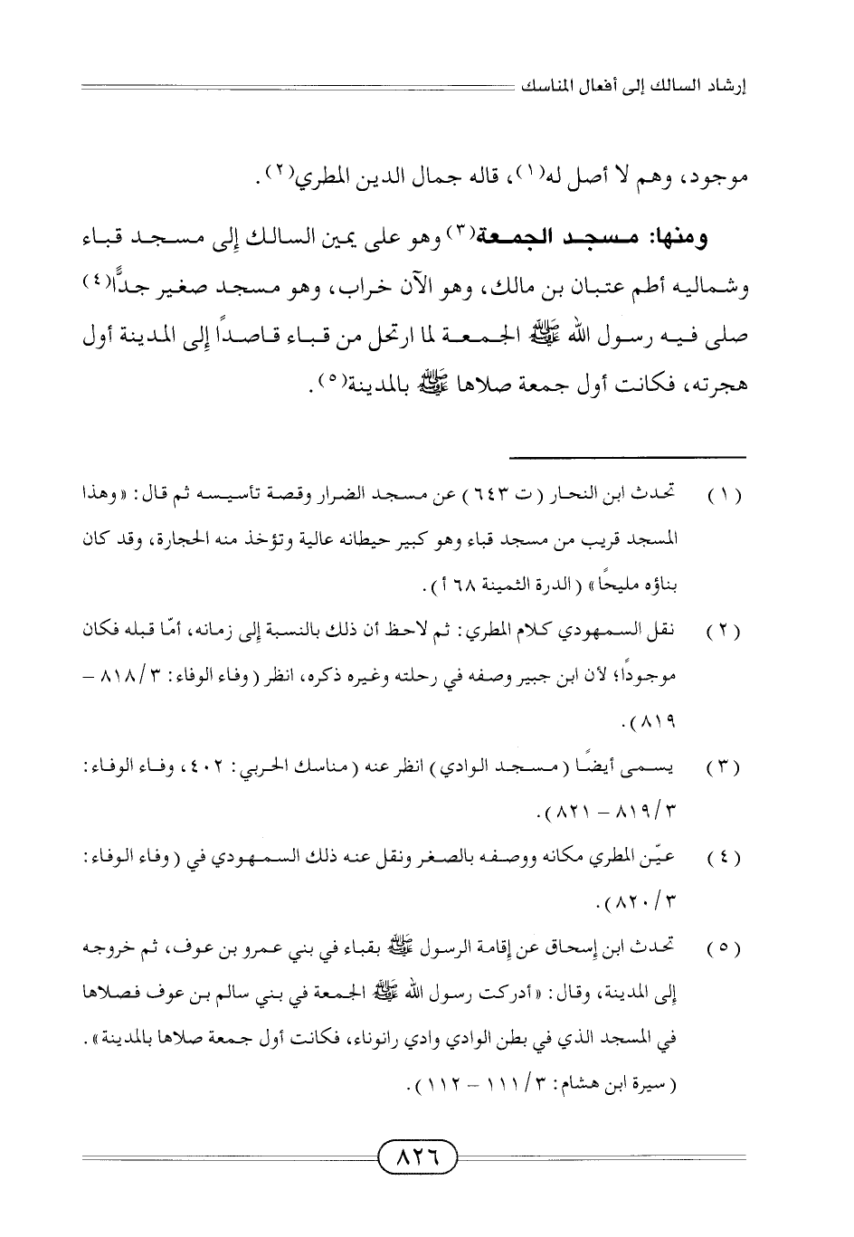(¬2) نقل السمهودي كلام المطري: ثم لاحظ أن ذلك بالنسبة إِلى زمانه، أمّا قبله فكان موجودًا؛ لأن ابن جبير وصفه في رحلته وغيره ذكره، انظر (وفاء الوفاء: 3/ 818 - 819).