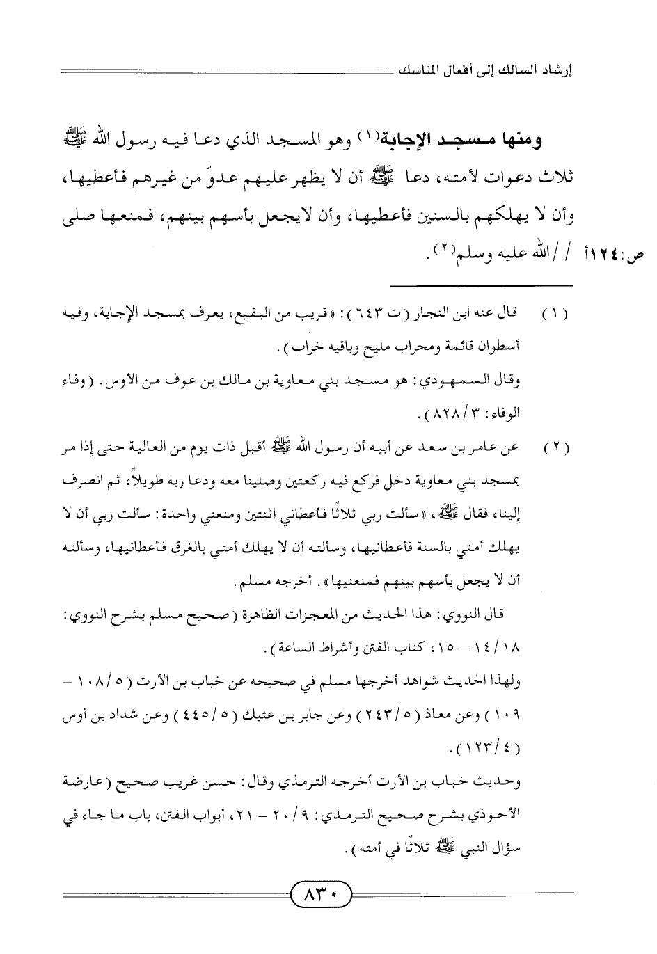 ومنها مسجد الإجابة (¬1) وهو المسجد الذي دعا فيه رسول الله - صلى الله عليه وسلم - ثلاث دعوات لأمته، دعا - صلى الله عليه وسلم - أن لا يظهر عليهم عدوّ من غيرهم فأعطيها، وأن لا يهلكهم بالسنين فأعطيها، وأن لا يجعل بأسهم بينهم، فمنعها صلى الله عليه وسلم (¬2).
