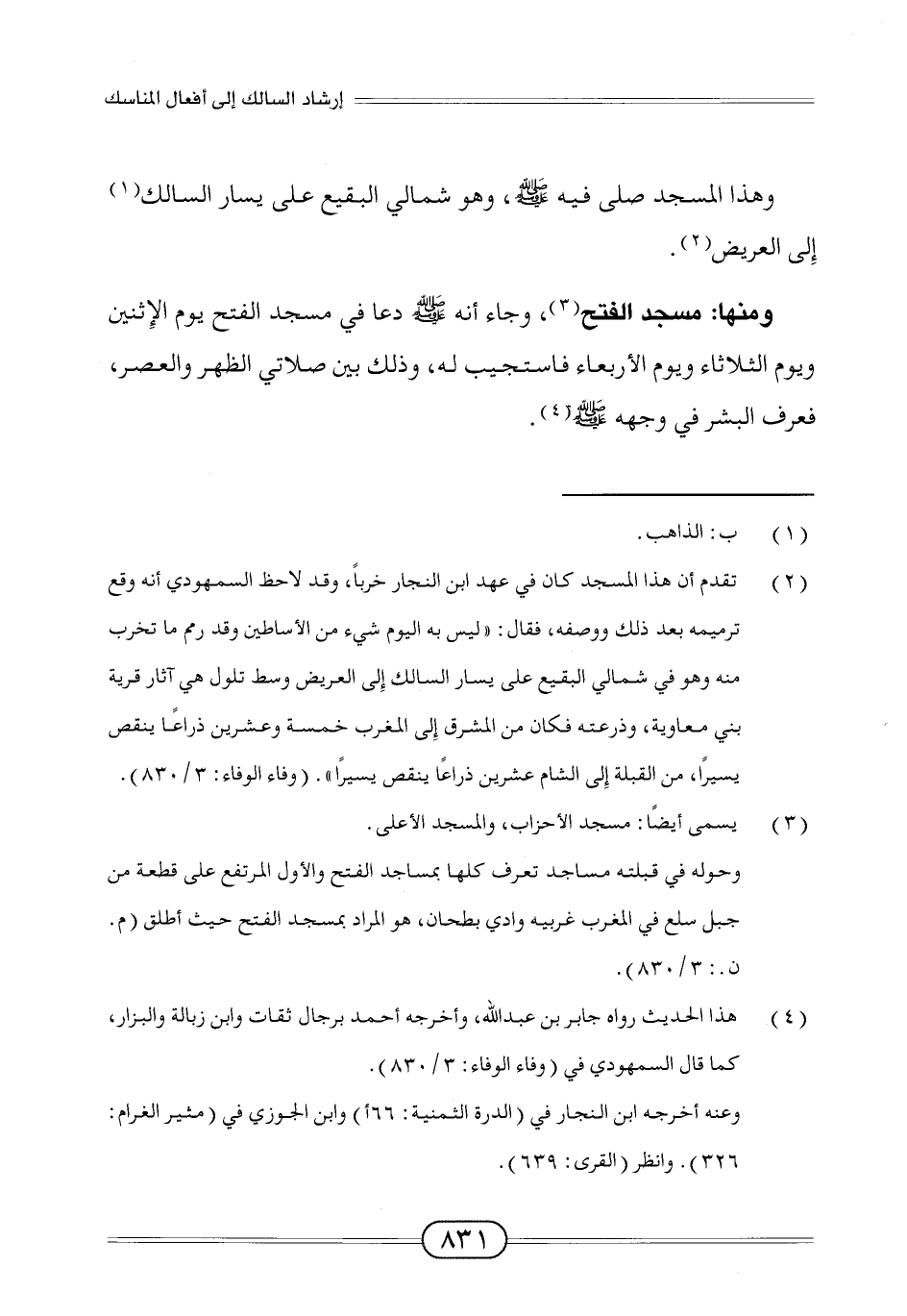 وهذا المسجد صلى فيه - صلى الله عليه وسلم -، وهو شمالي البقيع على يسار السالك (¬1) إِلى العريض (¬2).