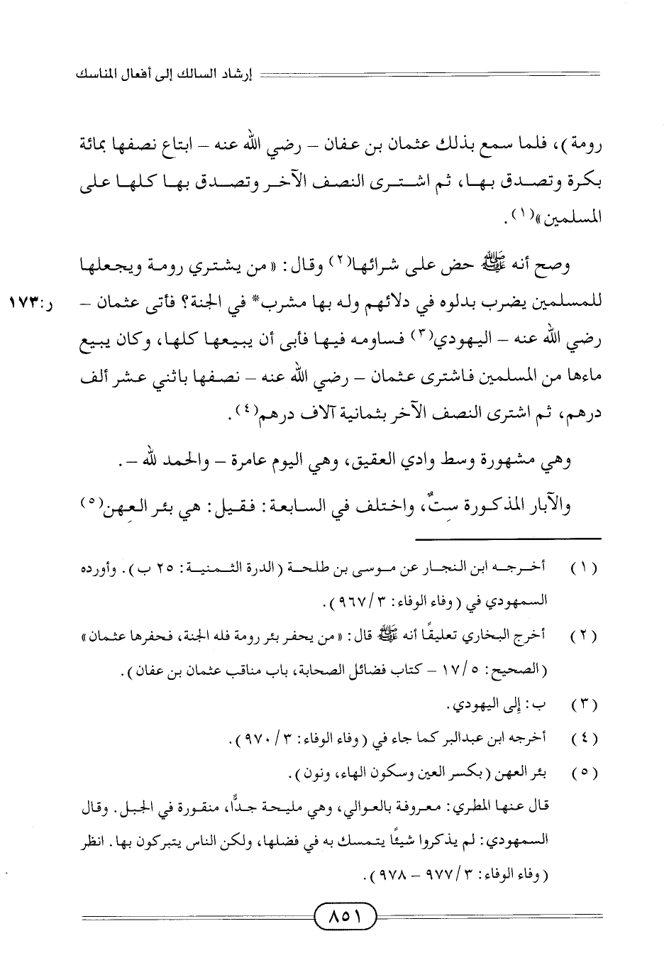 وصح أنه - صلى الله عليه وسلم - حض على شرائها (¬2) وقال: "من يشتري رومة ويجعلها للمسلمين يضرب بدلوه في دلائهم وله بها مشرب * في الجنة؟ فأتى عثمان - رضي الله عنه - اليهودي (¬3) فساومه فيها فأبى أن يبيعها كلها، وكان يبيع ماءها من المسلمين فاشترى عثمان - رضي الله عنه - نصفها باثني عشر ألف درهم، ثم اشترى النصف الآخر بثمانية آلاف درهم (¬4).