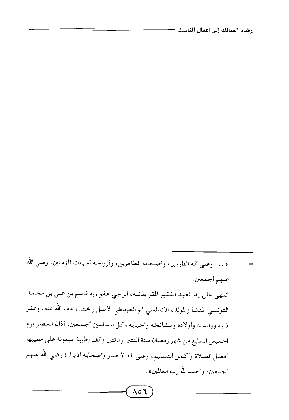 انتهى على يد العبد الفقير المقر بذنبه، الراجي عفو ربه قاسم بن علي بن محمد التونسي المنشأ والمولد، الأندلسي ثم الغرناطي الأصل والمحتد، عفا الله عنه، وغفر ذنبه ووالديه وأولاده ومشائخه وأحبابه وكل المسلمين أجمعين، أذان العصر يوم الخميس السابع من شهر رمضان سنة اثنتين ومائتين وألف بطيبة الميمونة على مطيبها أفضل الصلاة وأكمل التسليم، وعلى آله الأخيار وأصحابه الأبرار؛ رضي الله عنهم أجمعين، والحمد لله رب العالمين".