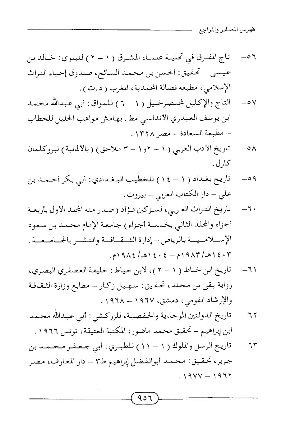 63 - تاريخ الرسل والملوك (1 - 11) للطبري: أبي جعفر محمد بن جرير، تحقيق: محمد أبو الفضل إِبراهيم ط 3 - دار المعارف، مصر 1962 - 1977.